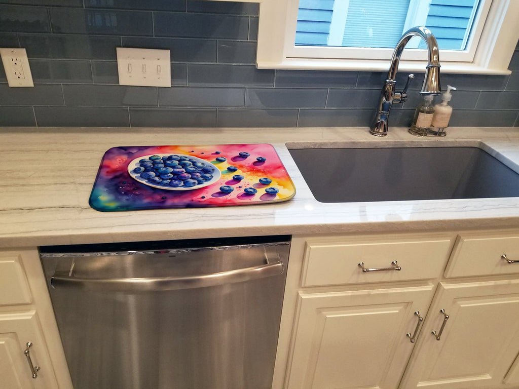 Dish Drying Mat featuring breed specific Blueberries artwork. Say goodbye to messy countertops and soggy dish towels with our innovative dish drying mat. Our high-quality dish drying pad is designed to keep your countertops dry while offering a stylish and efficient solution. Whether you're air drying dishes, glasses, stemware, silverware, pots, pans, bottles, or even fruits and vegetables, our dish mat is the perfect choice. The 14 inches x 22 inches size fits most counters and dish drying racks, and the non-slip design ensures stability. Made with water-absorbent polyester and a polyurethane foam insert, our dish drying mat is not only functional but also durable. It's machine washable and printed in the USA for long-lasting use. The beautiful artwork adds flair to your kitchen decor, making it a perfect housewarming gift or present for any occasion. Upgrade your kitchen experience with our absorbent and versatile dish drying mat.
