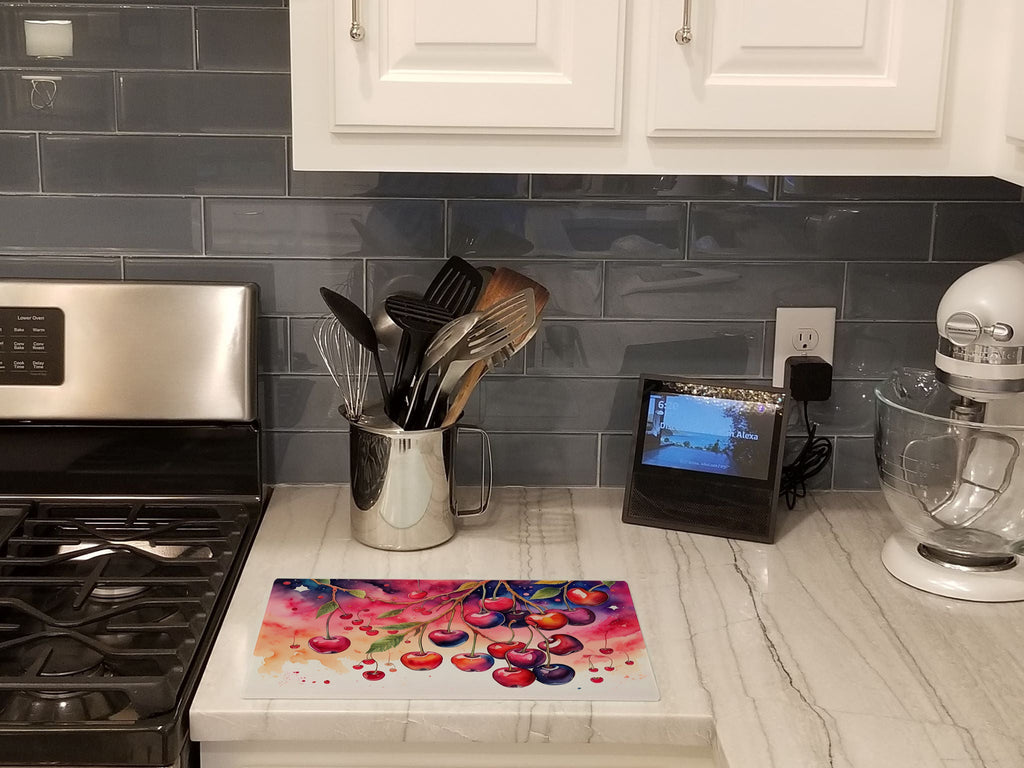 Decorate your space with our Cherries artwork on a Cutting Board. Introduce your kitchen to the vibrant, large Decorative Glass Cutting Board from Caroline's Treasures. Crafted from resilient tempered glass, this board is not only a utilitarian necessity but also a colorful art piece. With its generous dimensions of 15 inches in height and 12 inches in length, it offers ample space for all your cutting needs. Every piece showcases captivating artwork from distinguished artists, bringing an aesthetic edge to your kitchen. Beyond its attractive design, this cutting board ensures your countertop stays pristine and unscathed, owing to its heat-resistant properties. Engineered with user convenience in mind, it features non-skid feet for stability, and rounded corners for additional safety. Its robust construction renders it virtually unbreakable, guaranteeing longevity. The board comes with protective feet bumpers, maintaining its position during use. This product is recommended to be hand washed only. Proudly printed and assembled in the United States, this cutting board exemplifies superior craftsmanship. With Caroline's Treasures' Decorative Glass Cutting Board, you're investing in a blend of functionality and artistic flair.