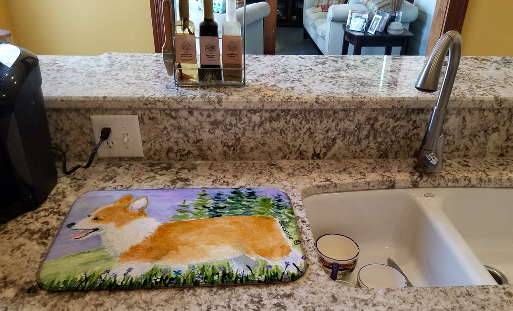Decorate your space with our Corgi artwork on a Dish Drying Mat. Say goodbye to messy countertops and soggy dish towels with our innovative dish drying mat. Our high-quality dish drying pad is designed to keep your countertops dry while offering a stylish and efficient solution. Whether you're air drying dishes, glasses, stemware, silverware, pots, pans, bottles, or even fruits and vegetables, our dish mat is the perfect choice. The 14 inches x 22 inches size fits most counters and dish drying racks, and the non-slip design ensures stability. Made with water-absorbent polyester and a polyurethane foam insert, our dish drying mat is not only functional but also durable. It's machine washable and printed in the USA for long-lasting use. The beautiful artwork adds flair to your kitchen decor, making it a perfect housewarming gift or present for any occasion. Upgrade your kitchen experience with our absorbent and versatile dish drying mat.