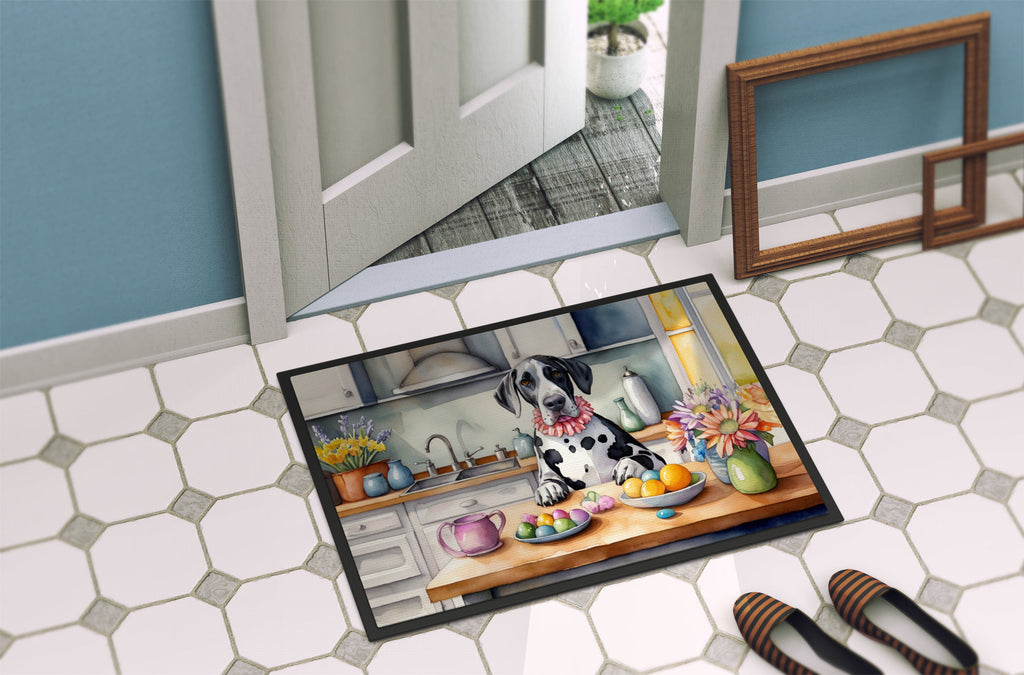 Decorate your space with our Easter Great Dane artwork on a Doormat. Welcome your guests in style with our Artwork Door Mat, designed to withstand almost any weather condition. This mat, measuring approximately 18 by 27 inches, is held together by durable black binding tape. Its top layer, composed of polyester felt, is dyed with the eye-catching image you see on the mat. A few layers below provide the mat with stability, while its rubber bottom is stamped to help prevent slipping and ensures safety. Our mat works wonderfully as both an indoor or outdoor door mat. For cleaning, simply hose it off with water or use a power washer - no need for any cleaner that produces suds. Avoid scrubbing with a brush, instead, opt for the vacuum on floor setting. Designed manufactured and printed in the USA, this mat is a perfect addition to your porch, outdoor kitchen, entryway, or any indoor space. Its unique design makes it a charming decorative rug that greets your guests and adds a stylish touch to your home decor.