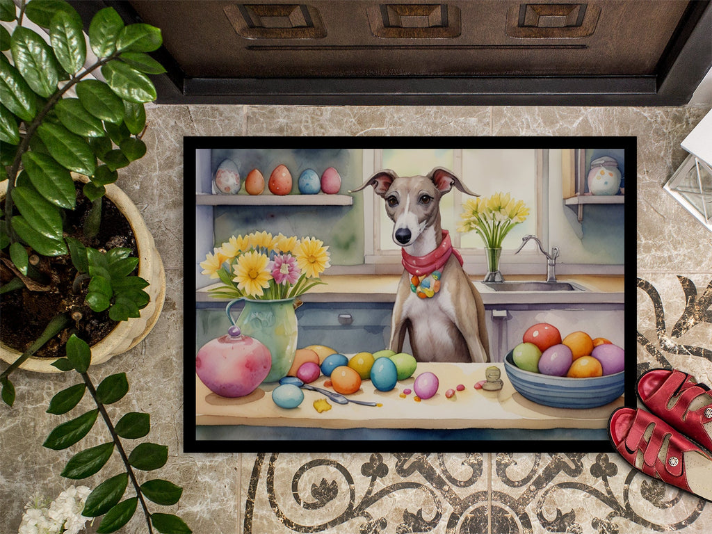 Decorate your space with our Easter Whippet artwork on a Doormat. Welcome your guests in style with our Artwork Door Mat, designed to withstand almost any weather condition. This mat, measuring approximately 24 by 36 inches, is held together by durable black binding tape. Its top layer, composed of polyester felt, is dyed with the eye-catching image you see on the mat. A few layers below provide the mat with stability, while its rubber bottom is stamped to help prevent slipping and ensures safety. Our mat works wonderfully as both an indoor or outdoor door mat. For cleaning, simply hose it off with water or use a power washer - no need for any cleaner that produces suds. Avoid scrubbing with a brush, instead, opt for the vacuum on floor setting. Designed manufactured and printed in the USA, this mat is a perfect addition to your porch, outdoor kitchen, entryway, or any indoor space. Its unique design makes it a charming decorative rug that greets your guests and adds a stylish touch to your home decor.
