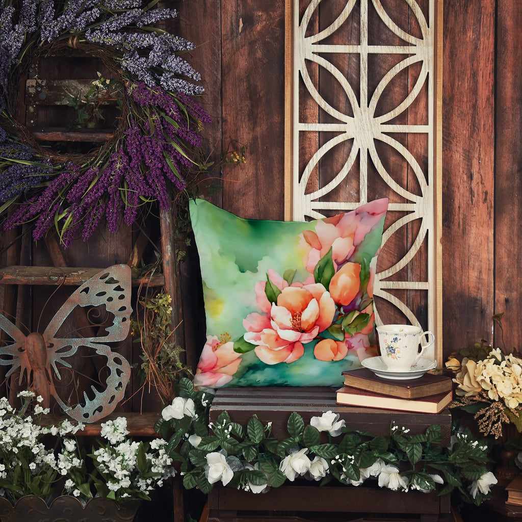Throw Pillow featuring breed specific Delaware Peach Blossom artwork. Add a touch of vibrancy and comfort to your outdoor seating with Caroline's Treasures Fabric Decorative Pillow. Measuring approximately 14 inches by 14 inches, this outdoor pillow is crafted to elevate the appeal of your patio furniture, infusing it with vivid color and artistic flair. The pillow includes a 100% Polyester Fabric sham filled with a quality pillow form to provide superior comfort. Innovatively made from our brand new material, specifically woven for its water resistance, this pillow is designed for durability. The soft canvas fabric offers versatility in use, fit for your indoor couch or your outdoor patio, porch, or veranda. The fabric is dyed with colorfast dyes built for resilience against weather conditions, ensuring the pillow retains its beauty over time. Constructed by sewing three fabric pieces to create a sham, the polyester insert is then nestled inside to form the pillow, resulting in an overstuffed pillow that maintains its shape. Both the sham and the pillow insert are proudly made in the United States. As the pillows are handcrafted, there may be minor variations in size, further enhancing their unique charm. Experience comfort in style with Caroline's Treasures Fabric Decorative Pillow.