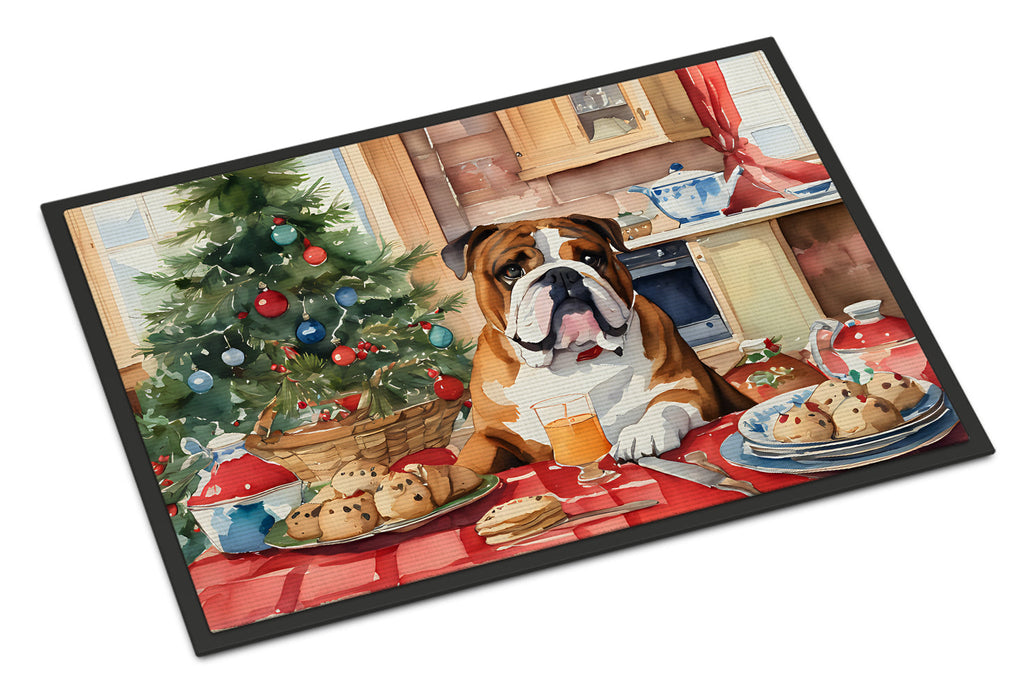 Decorate your space with our Christmas English Bulldog artwork on a Doormat. Welcome your guests in style with our Artwork Door Mat, designed to withstand almost any weather condition. This mat, measuring approximately 18 by 27 inches, is held together by durable black binding tape. Its top layer, composed of polyester felt, is dyed with the eye-catching image you see on the mat. A few layers below provide the mat with stability, while its rubber bottom is stamped to help prevent slipping and ensures safety. Our mat works wonderfully as both an indoor or outdoor door mat. For cleaning, simply hose it off with water or use a power washer - no need for any cleaner that produces suds. Avoid scrubbing with a brush, instead, opt for the vacuum on floor setting. Designed manufactured and printed in the USA, this mat is a perfect addition to your porch, outdoor kitchen, entryway, or any indoor space. Its unique design makes it a charming decorative rug that greets your guests and adds a stylish touch to your home decor.