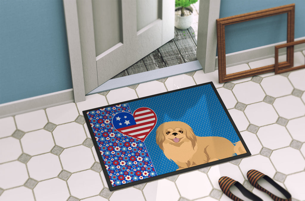 Decorate your space with our Pekingese artwork on a Doormat. Welcome your guests in style with our Artwork Door Mat, designed to withstand almost any weather condition. This mat, measuring approximately 24 by 36 inches, is held together by durable black binding tape. Its top layer, composed of polyester felt, is dyed with the eye-catching image you see on the mat. A few layers below provide the mat with stability, while its rubber bottom is stamped to help prevent slipping and ensures safety. Our mat works wonderfully as both an indoor or outdoor door mat. For cleaning, simply hose it off with water or use a power washer - no need for any cleaner that produces suds. Avoid scrubbing with a brush, instead, opt for the vacuum on floor setting. Designed manufactured and printed in the USA, this mat is a perfect addition to your porch, outdoor kitchen, entryway, or any indoor space. Its unique design makes it a charming decorative rug that greets your guests and adds a stylish touch to your home decor.