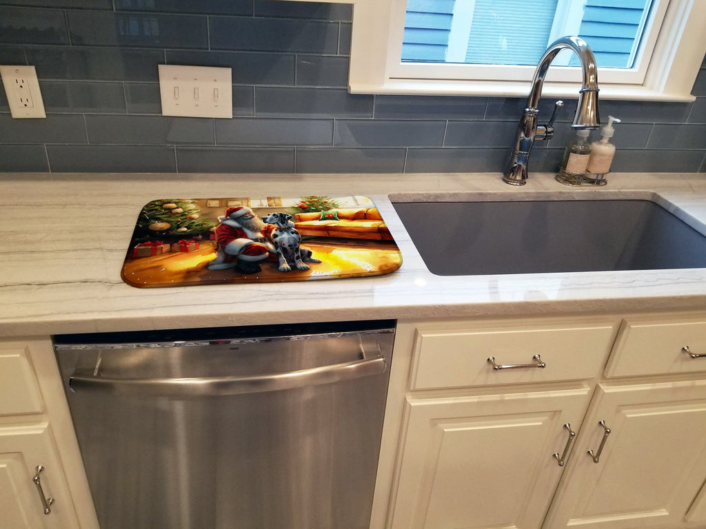 Dish Drying Mat featuring breed specific Great Dane artwork. Celebrate Christmas with this Christmas Dish Drying Mat. Say goodbye to messy countertops and soggy dish towels with our innovative dish drying mat. Our high-quality dish drying pad is designed to keep your countertops dry while offering a stylish and efficient solution. Whether you're air drying dishes, glasses, stemware, silverware, pots, pans, bottles, or even fruits and vegetables, our dish mat is the perfect choice. The 14 inches x 22 inches size fits most counters and dish drying racks, and the non-slip design ensures stability. Made with water-absorbent polyester and a polyurethane foam insert, our dish drying mat is not only functional but also durable. It's machine washable and printed in the USA for long-lasting use. The beautiful artwork adds flair to your kitchen decor, making it a perfect housewarming gift or present for any occasion. Upgrade your kitchen experience with our absorbent and versatile dish drying mat.
