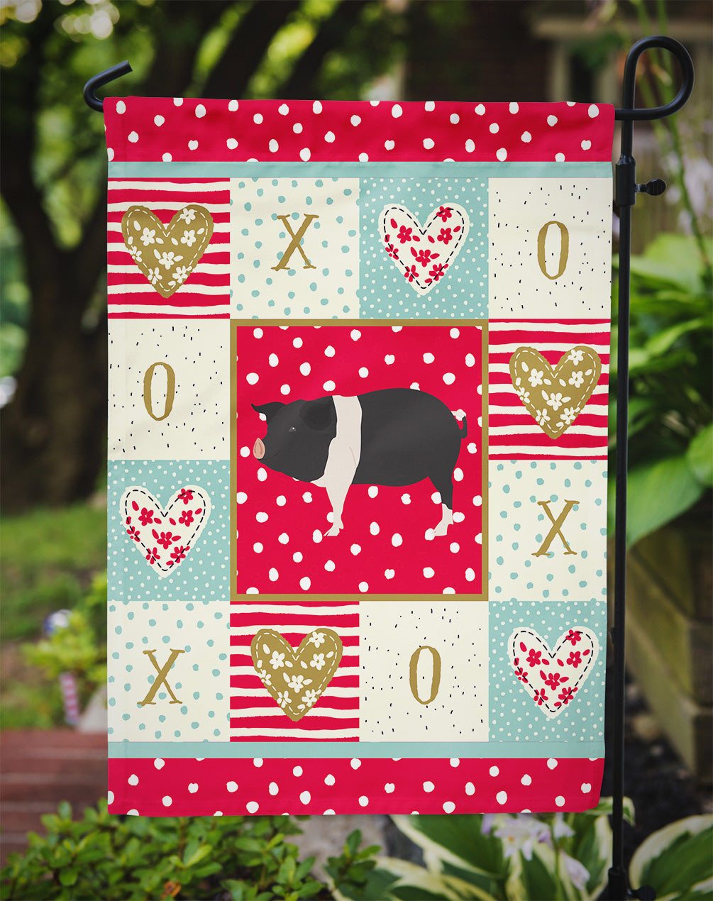 Decorate your space with our Valentine's Day Hampshire Pig artwork on a Garden Flag. Enhance the beauty of your garden, patio, or yard with Caroline's Treasures Decorative Garden Flag, proudly made in the USA. Crafted from two pieces of thick, double-sided polyester fabric, this 2-ply garden flag is designed to withstand various weather conditions, making it water-resistant and weatherproof. Featuring correctly readable words on both sides, this garden flag offers a delightful visual experience from any angle. With its heavier weight, it stands out among other garden flags, ensuring stability and durability even in wind, rain, and snow. Measuring approximately 11 1/4 inches by 15 1/2 inches, this flag allows you to personalize your outdoor decor. It comes with a 1 1/2-inch sleeve sewn in, allowing easy attachment to any standard garden flag stand or garden size porch hanger (sold separately). Make a statement in your outdoor space with Caroline's Treasures Decorative Garden Flag, a vibrant and high-quality flag that adds color and personality to your surroundings. Proudly made in the USA, it's a symbol of quality craftsmanship and attention to detail.