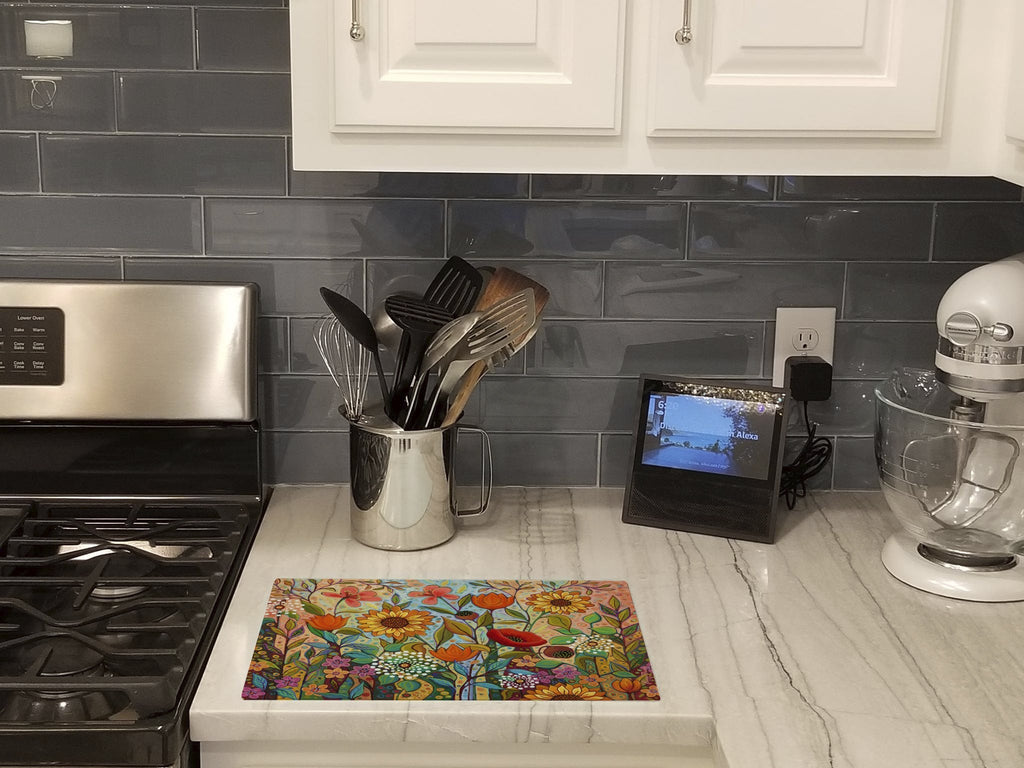 Bring a bit of Spring into your home with a Spring Cutting Board. Introduce your kitchen to the vibrant, large Decorative Glass Cutting Board from Caroline's Treasures. Crafted from resilient tempered glass, this board is not only a utilitarian necessity but also a colorful art piece. With its generous dimensions of 15 inches in height and 12 inches in length, it offers ample space for all your cutting needs. Every piece showcases captivating artwork from distinguished artists, bringing an aesthetic edge to your kitchen. Beyond its attractive design, this cutting board ensures your countertop stays pristine and unscathed, owing to its heat-resistant properties. Engineered with user convenience in mind, it features non-skid feet for stability, and rounded corners for additional safety. Its robust construction renders it virtually unbreakable, guaranteeing longevity. The board comes with protective feet bumpers, maintaining its position during use. This product is recommended to be hand washed only. Proudly printed and assembled in the United States, this cutting board exemplifies superior craftsmanship. With Caroline's Treasures' Decorative Glass Cutting Board, you're investing in a blend of functionality and artistic flair.