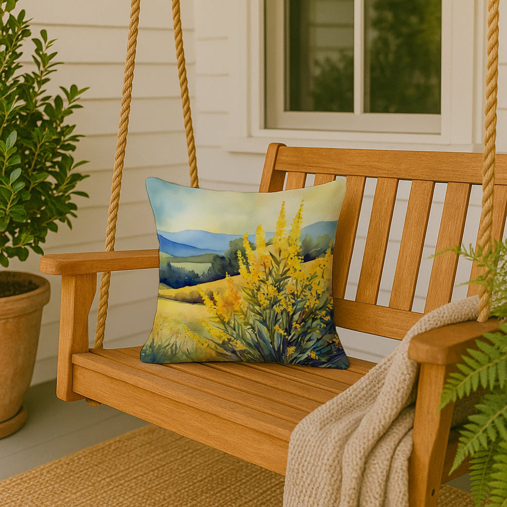 Throw Pillow featuring breed specific Kentucky Goldenrod artwork. Revitalize your outdoor or indoor living space with Caroline's Treasures 18x18 Fabric Decorative Pillow. With a generously sized dimension of approximately 18 inches by 18 inches, this pillow makes a comfortable and aesthetic addition to any seating area. Made from a unique, water-resistant material developed by Caroline's Treasures, the pillow sham is 100% polyester fabric that's durable and ready to weather any condition. Its vibrant, full-color artwork will not fade over time as it is dyed with color-fast dyes. Whether you place it on your patio furniture, porch, veranda, or indoor couch, its soft canvas fabric ensures a cozy experience. The pillow is handcrafted in the United States, featuring a sham created from three pieces of fabric and a polyester insert for enduring shape and overstuffed comfort. Despite being robustly built to endure the outdoors, it is as soft and snug as your favorite indoor cushions. Please note, as all our pillows are handmade, sizes may vary slightly, adding to the charm of this unique decorative item.