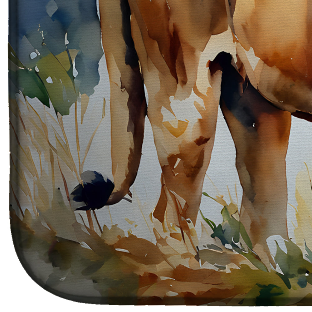 Dish Drying Mat featuring breed specific Lion artwork. Say goodbye to messy countertops and soggy dish towels with our innovative dish drying mat. Our high-quality dish drying pad is designed to keep your countertops dry while offering a stylish and efficient solution. Whether you're air drying dishes, glasses, stemware, silverware, pots, pans, bottles, or even fruits and vegetables, our dish mat is the perfect choice. The 14 inches x 22 inches size fits most counters and dish drying racks, and the non-slip design ensures stability. Made with water-absorbent polyester and a polyurethane foam insert, our dish drying mat is not only functional but also durable. It's machine washable and printed in the USA for long-lasting use. The beautiful artwork adds flair to your kitchen decor, making it a perfect housewarming gift or present for any occasion. Upgrade your kitchen experience with our absorbent and versatile dish drying mat.