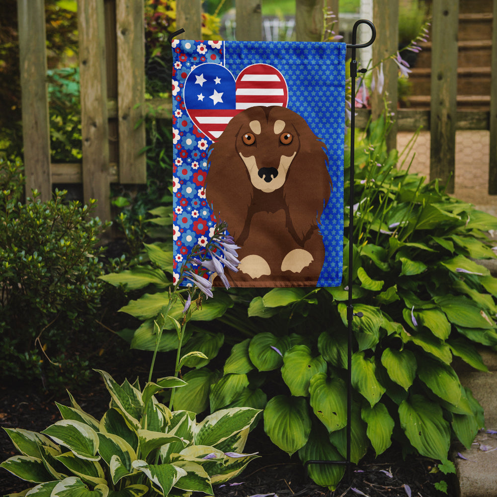 Decorate your space with our Dachshund artwork on a Garden Flag. Enhance the beauty of your garden, patio, or yard with Caroline's Treasures Decorative Garden Flag, proudly made in the USA. Crafted from two pieces of thick, double-sided polyester fabric, this 2-ply garden flag is designed to withstand various weather conditions, making it water-resistant and weatherproof. Featuring correctly readable words on both sides, this garden flag offers a delightful visual experience from any angle. With its heavier weight, it stands out among other garden flags, ensuring stability and durability even in wind, rain, and snow. Measuring approximately 11 1/4 inches by 15 1/2 inches, this flag allows you to personalize your outdoor decor. It comes with a 1 1/2-inch sleeve sewn in, allowing easy attachment to any standard garden flag stand or garden size porch hanger (sold separately). Make a statement in your outdoor space with Caroline's Treasures Decorative Garden Flag, a vibrant and high-quality flag that adds color and personality to your surroundings. Proudly made in the USA, it's a symbol of quality craftsmanship and attention to detail.