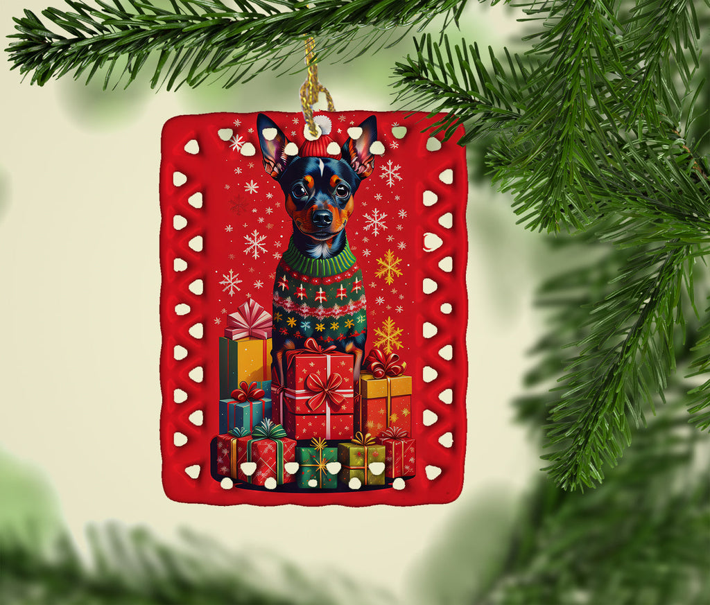 Porcelain Ornament featuring breed specific Miniature Pinscher artwork. Celebrate Christmas with this Christmas Ornament. Add a unique, personal touch to your holiday decor with our Rectangular Lattice Porcelain Ornament. Perfect for creating cherished memories, this high-quality ornament shines under festive lights, reflecting warmth and joy throughout your Christmas tree. Crafted with a glossy finish, it showcases vibrant, full-color artwork contributed by our talented artists, ensuring your tree is adorned with a burst of color and holiday spirit. What sets this Porcelain Ornament apart is its customizable white back. Use a paint pen or permanent marker to write a heartfelt message, commemorate a special year, or mark an unforgettable date, turning this ornament into a keepsake that will be treasured for years to come. For best results, allow any personalization to dry thoroughly before handling. Each ornament comes complete with a delicate gold cord, making it easy to hang and display. Proudly made in the USA, this ornament measures 3.375 x 2.625 inches and is a thoughtful gift for pet sitters, teachers, family members, or anyone who would appreciate a little extra holiday magic. Bring style, charm, and a touch of personal meaning to your Christmas tree with this beautifully designed ornament..