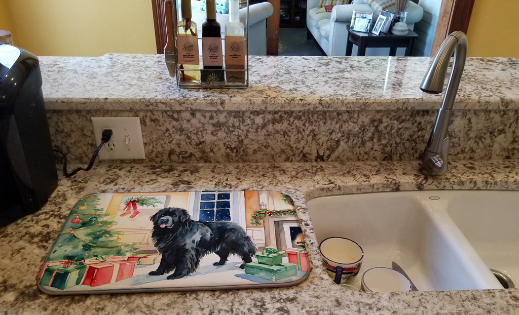 Dish Drying Mat featuring breed specific Newfoundland artwork. Celebrate Christmas with this Christmas Dish Drying Mat. Say goodbye to messy countertops and soggy dish towels with our innovative dish drying mat. Our high-quality dish drying pad is designed to keep your countertops dry while offering a stylish and efficient solution. Whether you're air drying dishes, glasses, stemware, silverware, pots, pans, bottles, or even fruits and vegetables, our dish mat is the perfect choice. The 14 inches x 22 inches size fits most counters and dish drying racks, and the non-slip design ensures stability. Made with water-absorbent polyester and a polyurethane foam insert, our dish drying mat is not only functional but also durable. It's machine washable and printed in the USA for long-lasting use. The beautiful artwork adds flair to your kitchen decor, making it a perfect housewarming gift or present for any occasion. Upgrade your kitchen experience with our absorbent and versatile dish drying mat.