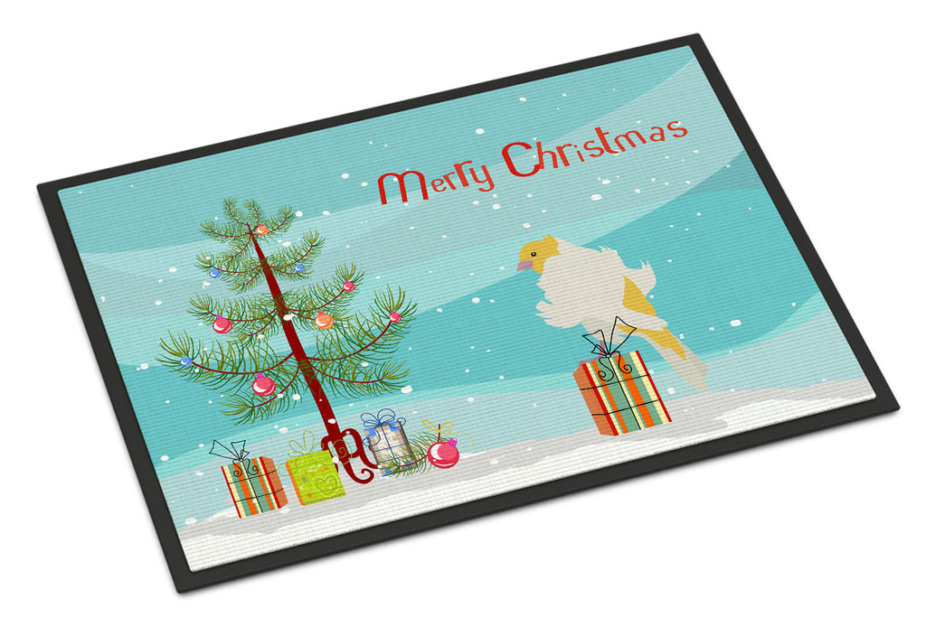 Decorate your space with our Christmas Parisian Trumpeter Canary artwork on a Doormat. Welcome your guests in style with our Artwork Door Mat, designed to withstand almost any weather condition. This mat, measuring approximately 24 by 36 inches, is held together by durable black binding tape. Its top layer, composed of polyester felt, is dyed with the eye-catching image you see on the mat. A few layers below provide the mat with stability, while its rubber bottom is stamped to help prevent slipping and ensures safety. Our mat works wonderfully as both an indoor or outdoor door mat. For cleaning, simply hose it off with water or use a power washer - no need for any cleaner that produces suds. Avoid scrubbing with a brush, instead, opt for the vacuum on floor setting. Designed manufactured and printed in the USA, this mat is a perfect addition to your porch, outdoor kitchen, entryway, or any indoor space. Its unique design makes it a charming decorative rug that greets your guests and adds a stylish touch to your home decor.
