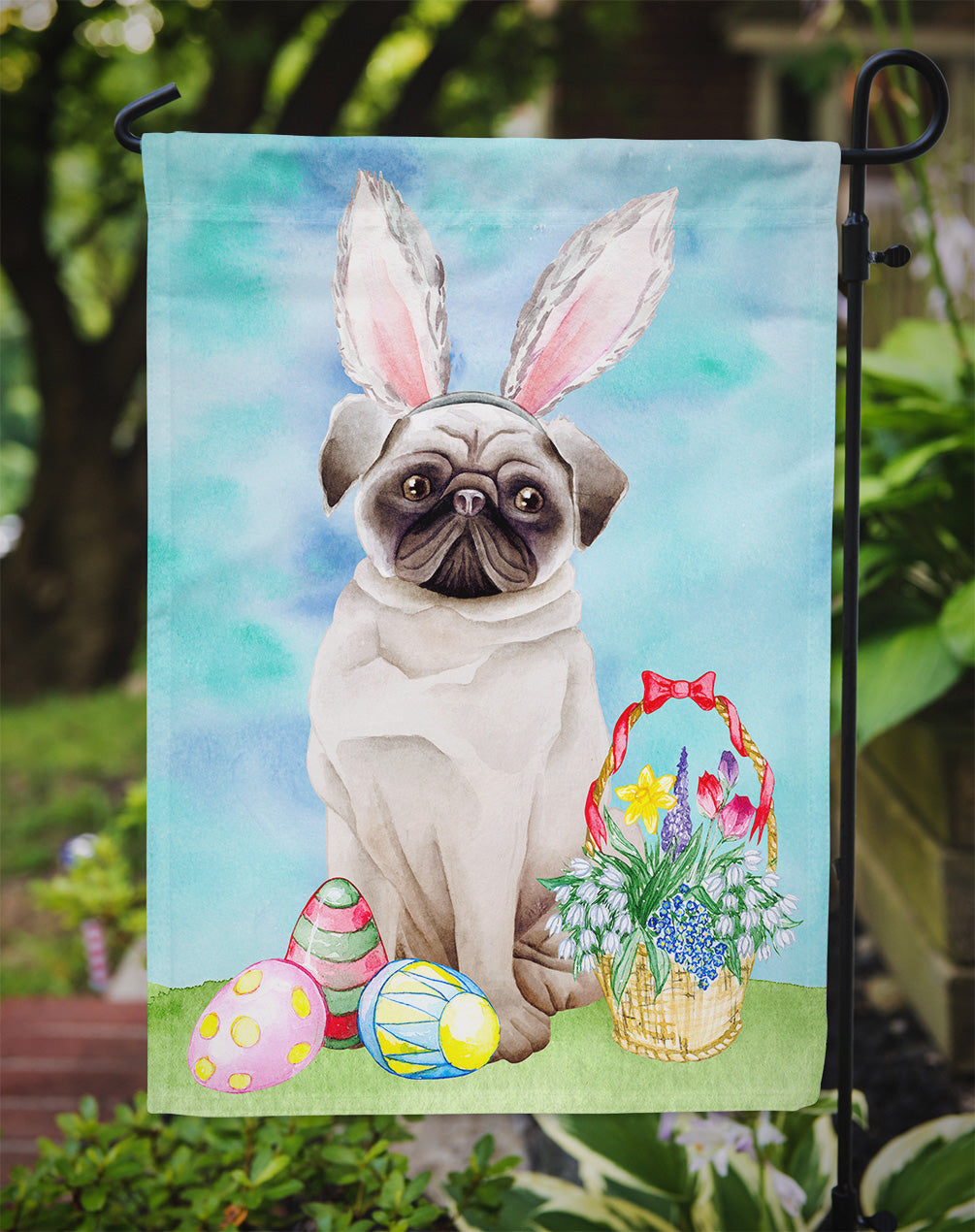 Decorate your space with our Easter Pug artwork on a Garden Flag. Enhance the beauty of your garden, patio, or yard with Caroline's Treasures Decorative Garden Flag, proudly made in the USA. Crafted from two pieces of thick, double-sided polyester fabric, this 2-ply garden flag is designed to withstand various weather conditions, making it water-resistant and weatherproof. Featuring correctly readable words on both sides, this garden flag offers a delightful visual experience from any angle. With its heavier weight, it stands out among other garden flags, ensuring stability and durability even in wind, rain, and snow. Measuring approximately 11 1/4 inches by 15 1/2 inches, this flag allows you to personalize your outdoor decor. It comes with a 1 1/2-inch sleeve sewn in, allowing easy attachment to any standard garden flag stand or garden size porch hanger (sold separately). Make a statement in your outdoor space with Caroline's Treasures Decorative Garden Flag, a vibrant and high-quality flag that adds color and personality to your surroundings. Proudly made in the USA, it's a symbol of quality craftsmanship and attention to detail.