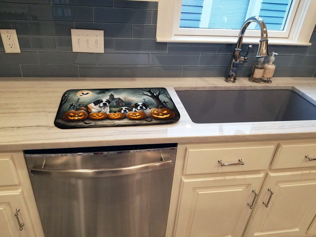 Dish Drying Mat featuring breed specific Saint Bernard artwork. Celebrate Halloween with this Halloween Dish Drying Mat. Say goodbye to messy countertops and soggy dish towels with our innovative dish drying mat. Our high-quality dish drying pad is designed to keep your countertops dry while offering a stylish and efficient solution. Whether you're air drying dishes, glasses, stemware, silverware, pots, pans, bottles, or even fruits and vegetables, our dish mat is the perfect choice. The 14 inches x 22 inches size fits most counters and dish drying racks, and the non-slip design ensures stability. Made with water-absorbent polyester and a polyurethane foam insert, our dish drying mat is not only functional but also durable. It's machine washable and printed in the USA for long-lasting use. The beautiful artwork adds flair to your kitchen decor, making it a perfect housewarming gift or present for any occasion. Upgrade your kitchen experience with our absorbent and versatile dish drying mat.