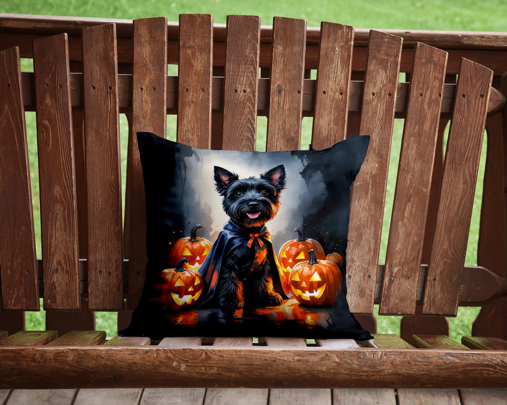Throw Pillow featuring breed specific Scottish Terrier artwork. Celebrate Halloween with this Halloween Pillow. Add a touch of vibrancy and comfort to your outdoor seating with Caroline's Treasures Fabric Decorative Pillow. Measuring approximately 14 inches by 14 inches, this outdoor pillow is crafted to elevate the appeal of your patio furniture, infusing it with vivid color and artistic flair. The pillow includes a 100% Polyester Fabric sham filled with a quality pillow form to provide superior comfort. Innovatively made from our brand new material, specifically woven for its water resistance, this pillow is designed for durability. The soft canvas fabric offers versatility in use, fit for your indoor couch or your outdoor patio, porch, or veranda. The fabric is dyed with colorfast dyes built for resilience against weather conditions, ensuring the pillow retains its beauty over time. Constructed by sewing three fabric pieces to create a sham, the polyester insert is then nestled inside to form the pillow, resulting in an overstuffed pillow that maintains its shape. Both the sham and the pillow insert are proudly made in the United States. As the pillows are handcrafted, there may be minor variations in size, further enhancing their unique charm. Experience comfort in style with Caroline's Treasures Fabric Decorative Pillow.