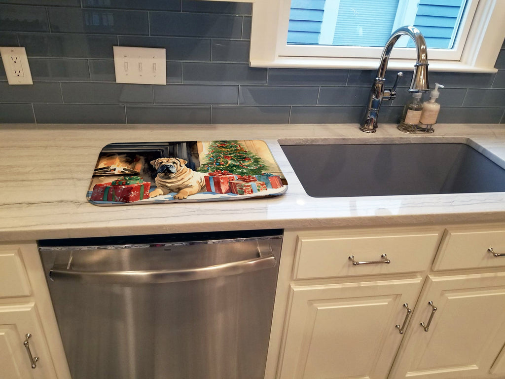 Dish Drying Mat featuring breed specific Shar Pei artwork. Celebrate Christmas with this Christmas Dish Drying Mat. Say goodbye to messy countertops and soggy dish towels with our innovative dish drying mat. Our high-quality dish drying pad is designed to keep your countertops dry while offering a stylish and efficient solution. Whether you're air drying dishes, glasses, stemware, silverware, pots, pans, bottles, or even fruits and vegetables, our dish mat is the perfect choice. The 14 inches x 22 inches size fits most counters and dish drying racks, and the non-slip design ensures stability. Made with water-absorbent polyester and a polyurethane foam insert, our dish drying mat is not only functional but also durable. It's machine washable and printed in the USA for long-lasting use. The beautiful artwork adds flair to your kitchen decor, making it a perfect housewarming gift or present for any occasion. Upgrade your kitchen experience with our absorbent and versatile dish drying mat.