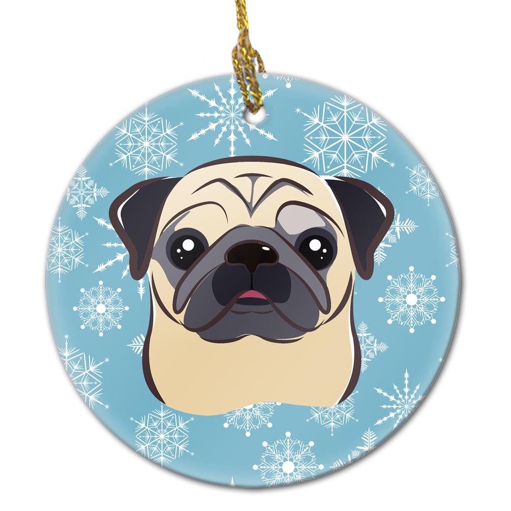 Decorate your space with our Christmas Pug artwork on a Ornament. Add a touch of personalized charm to your Christmas tree this holiday season with our Ceramic Ornament. Measuring 2.8125 inches in diameter, this round porcelain ornament beautifully reflects your festive lights, enhancing your holiday decor. The gloss surface sets off the vibrant, full-color artwork contributed by one of our talented artists, bringing a pop of color and joy to your tree. This Ceramic Ornament doesn't stop at being merely decorative. The white back is designed for personalization. Write a heartfelt message, mark a special year, or inscribe a date with a paint pen or a permanent marker to create a treasured memento. Please ensure you allow any personalization to dry thoroughly before handling to maintain the pristine finish. Included with the ornament is a delicate gold cord for easy hanging. Made in the USA, this Ceramic Ornament makes an exceptional gift for a pet sitter, teacher, family member, or anyone you wish to share a little Christmas magic with. With its blend of style, charm, and personal touch, it's a meaningful addition to any Christmas tree.