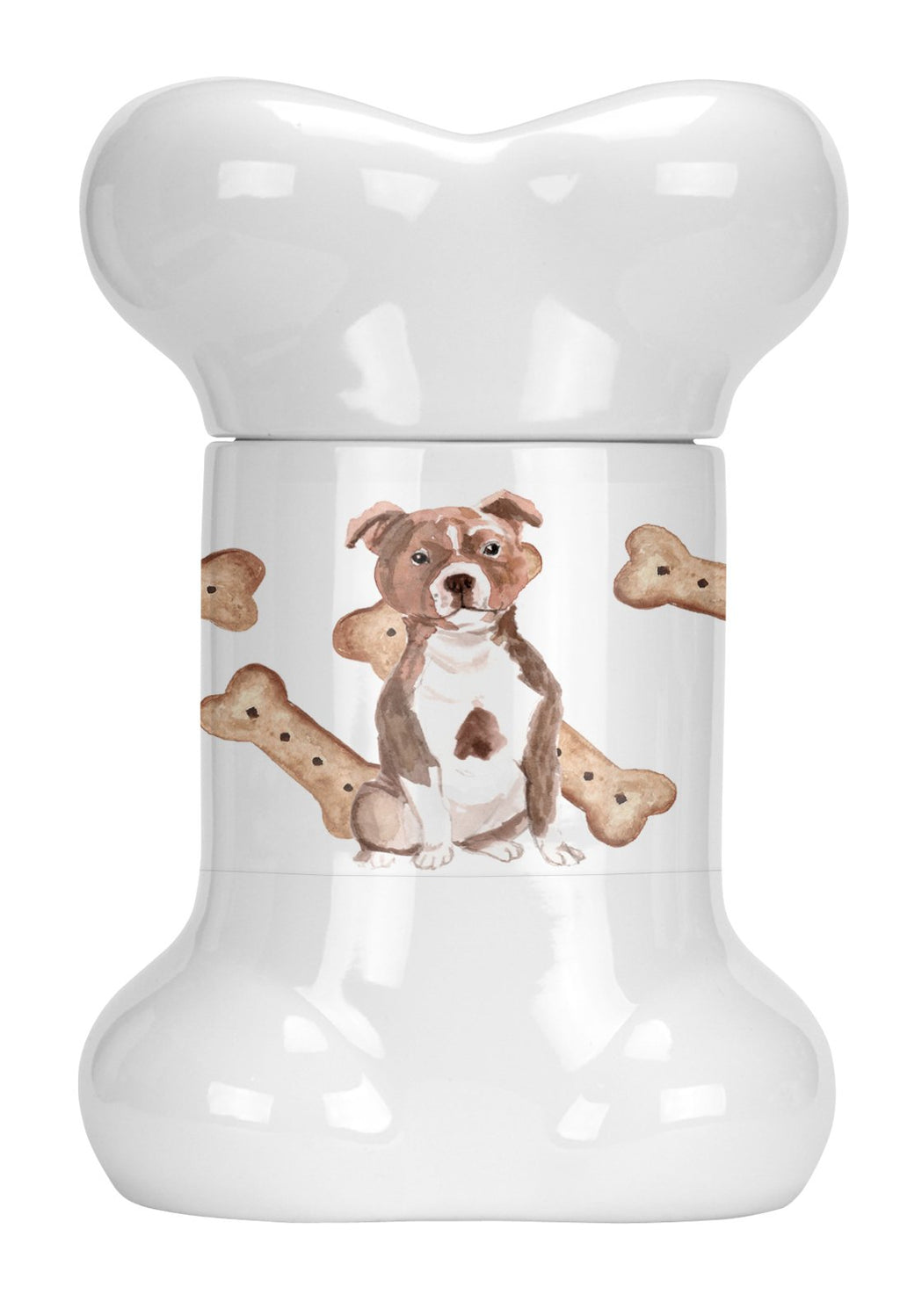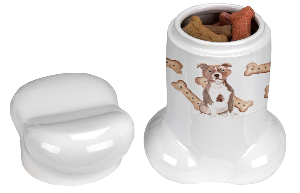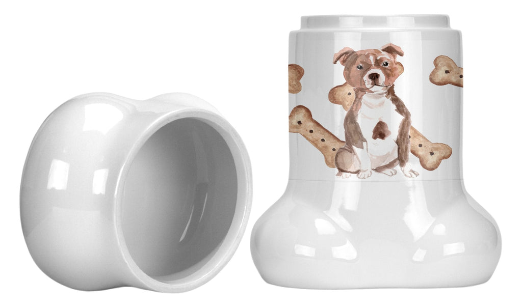 Decorate your space with our Staffordshire Bull Terrier artwork on a Bone Shaped Treat Jar. Pamper your furry friend with our exclusive Ceramic Bone-Shaped Treat Cookie Jar. This delightful jar, standing 9 inches tall and 6 inches wide at the base, offers ample storage for your dog's favorite biscuits or other animal treats. Crafted from durable ceramic, the jar is embellished with full-color artwork that adds a touch of whimsy to any kitchen decor. The lid is easily removable, providing convenient access to treats without a complicated seal. Despite its playful design, the jar maintains a high level of functionality. It's dishwasher safe, making cleaning a breeze. Whether you're a dog lover, a groomer, a pet sitter, or a pet parent, this treat jar is a perfect addition to your home or makes a thoughtful gift. Proudly decorated in our USA-based facility, this jar adds a unique charm that showcases your love for your four-legged companions.
