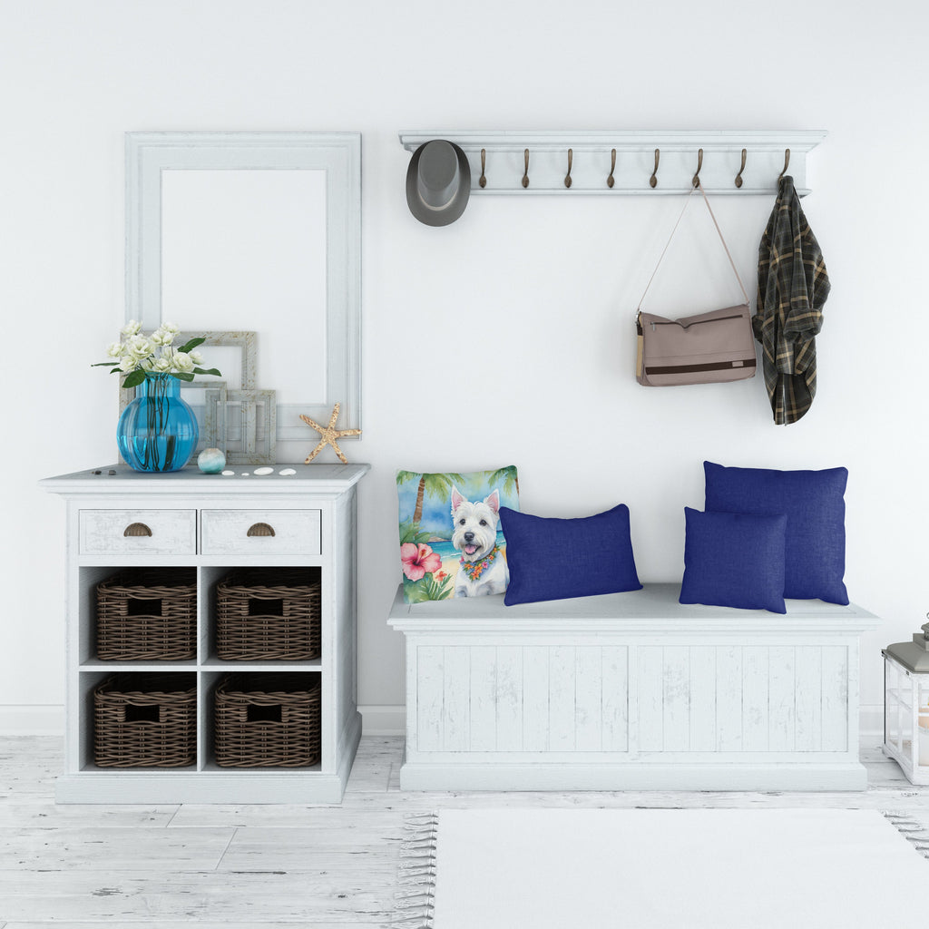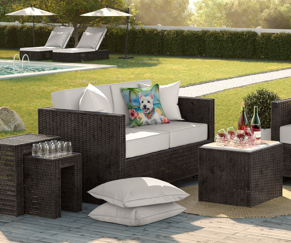 Decorate your space with our West Highland White Terrier artwork on a Pillow. Bring a bit of Summer into your home with a Summer Pillow. Revitalize your outdoor or indoor living space with Caroline's Treasures 18x18 Fabric Decorative Pillow. With a generously sized dimension of approximately 18 inches by 18 inches, this pillow makes a comfortable and aesthetic addition to any seating area. Made from a unique, water-resistant material developed by Caroline's Treasures, the pillow sham is 100% polyester fabric that's durable and ready to weather any condition. Its vibrant, full-color artwork will not fade over time as it is dyed with color-fast dyes. Whether you place it on your patio furniture, porch, veranda, or indoor couch, its soft canvas fabric ensures a cozy experience. The pillow is handcrafted in the United States, featuring a sham created from three pieces of fabric and a polyester insert for enduring shape and overstuffed comfort. Despite being robustly built to endure the outdoors, it is as soft and snug as your favorite indoor cushions. Please note, as all our pillows are handmade, sizes may vary slightly, adding to the charm of this unique decorative item.