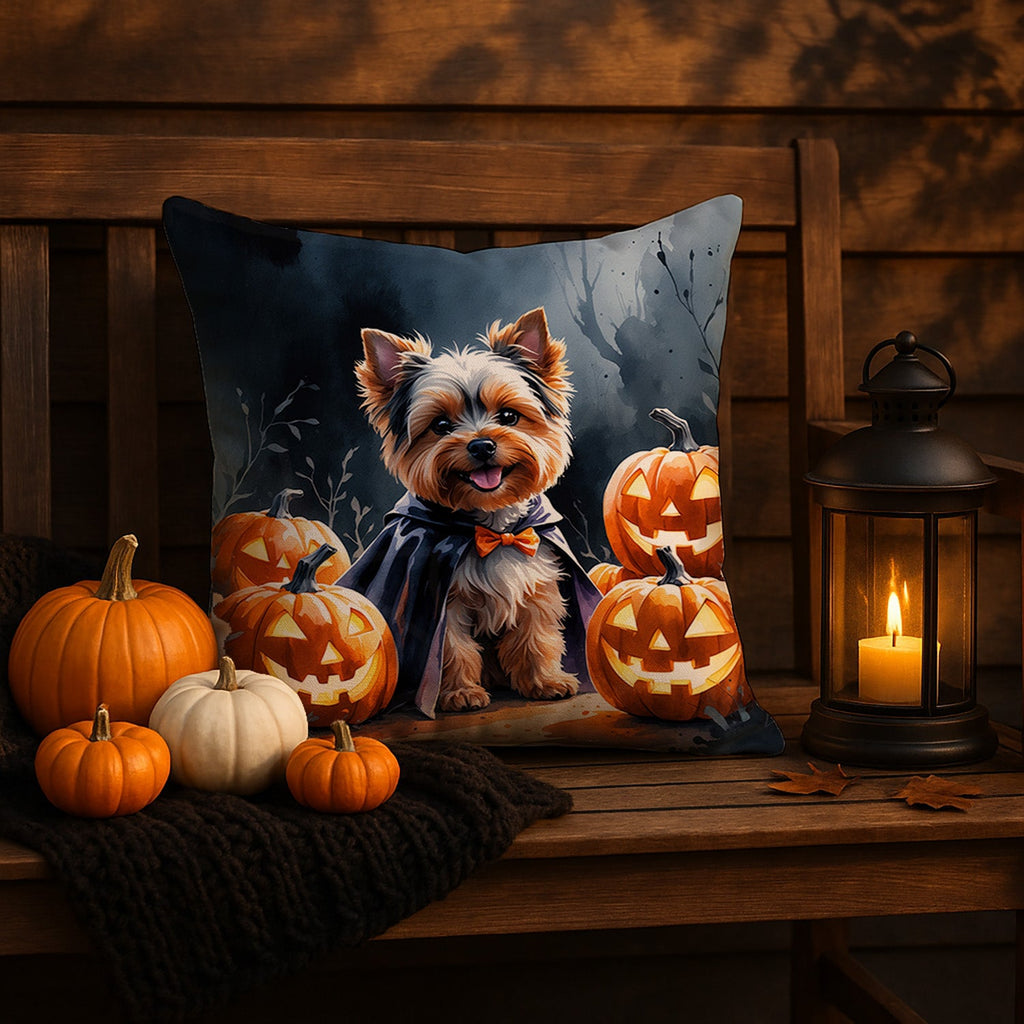 Throw Pillow featuring breed specific Yorkshire Terrier artwork. Celebrate Halloween with this Halloween Pillow. Revitalize your outdoor or indoor living space with Caroline's Treasures 18x18 Fabric Decorative Pillow. With a generously sized dimension of approximately 18 inches by 18 inches, this pillow makes a comfortable and aesthetic addition to any seating area. Made from a unique, water-resistant material developed by Caroline's Treasures, the pillow sham is 100% polyester fabric that's durable and ready to weather any condition. Its vibrant, full-color artwork will not fade over time as it is dyed with color-fast dyes. Whether you place it on your patio furniture, porch, veranda, or indoor couch, its soft canvas fabric ensures a cozy experience. The pillow is handcrafted in the United States, featuring a sham created from three pieces of fabric and a polyester insert for enduring shape and overstuffed comfort. Despite being robustly built to endure the outdoors, it is as soft and snug as your favorite indoor cushions. Please note, as all our pillows are handmade, sizes may vary slightly, adding to the charm of this unique decorative item.