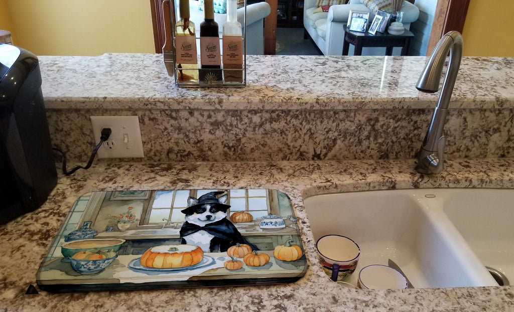 Dish Drying Mat featuring breed specific Akita artwork. Celebrate Halloween with this Halloween Dish Drying Mat. Say goodbye to messy countertops and soggy dish towels with our innovative dish drying mat. Our high-quality dish drying pad is designed to keep your countertops dry while offering a stylish and efficient solution. Whether you're air drying dishes, glasses, stemware, silverware, pots, pans, bottles, or even fruits and vegetables, our dish mat is the perfect choice. The 14 inches x 22 inches size fits most counters and dish drying racks, and the non-slip design ensures stability. Made with water-absorbent polyester and a polyurethane foam insert, our dish drying mat is not only functional but also durable. It's machine washable and printed in the USA for long-lasting use. The beautiful artwork adds flair to your kitchen decor, making it a perfect housewarming gift or present for any occasion. Upgrade your kitchen experience with our absorbent and versatile dish drying mat.