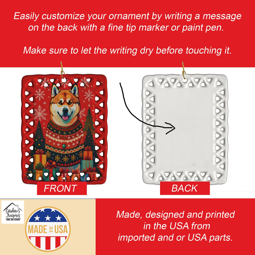 Porcelain Ornament featuring breed specific Akita artwork. Celebrate Christmas with this Christmas Ornament. Add a unique, personal touch to your holiday decor with our Rectangular Lattice Porcelain Ornament. Perfect for creating cherished memories, this high-quality ornament shines under festive lights, reflecting warmth and joy throughout your Christmas tree. Crafted with a glossy finish, it showcases vibrant, full-color artwork contributed by our talented artists, ensuring your tree is adorned with a burst of color and holiday spirit. What sets this Porcelain Ornament apart is its customizable white back. Use a paint pen or permanent marker to write a heartfelt message, commemorate a special year, or mark an unforgettable date, turning this ornament into a keepsake that will be treasured for years to come. For best results, allow any personalization to dry thoroughly before handling. Each ornament comes complete with a delicate gold cord, making it easy to hang and display. Proudly made in the USA, this ornament measures 3.375 x 2.625 inches and is a thoughtful gift for pet sitters, teachers, family members, or anyone who would appreciate a little extra holiday magic. Bring style, charm, and a touch of personal meaning to your Christmas tree with this beautifully designed ornament..