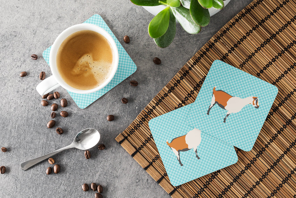 Decorate your space with our Alpine Goat artwork on a Coaster set. Presenting our Set of 4 Foam Coasters, a stylish and practical addition to your table setting. Each square coaster, measuring 3 1/2 inches by 3 1/2 inches, is perfectly sized to accommodate various drinkware, from coffee mugs to tumblers. These coasters stand out with their full-color artwork, permanently dyed onto the material for a vibrant and fade-resistant finish. They're not just functional, they're a fashionable statement, adding a touch of flair to any gathering or event. Our foam coasters serve a dual purpose - they protect your table from water stains and are perfect for both hot and cold drinks. The material used is similar to that of our high-quality mouse pads, ensuring durability and heat resistance. These coasters are easy to maintain - simply wash them in the top of your dishwasher and lay flat to dry. The design won't come off, ensuring they retain their vivid colors for years. Pair them with one of our insulated coolers or huggers for a cohesive, thoughtful gift set. Enhance your beverage experience with our Set of 4 Foam Coasters.