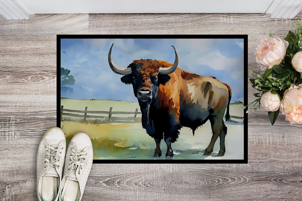 Decorate your space with our American Bison artwork on a Doormat. Welcome your guests in style with our Artwork Door Mat, designed to withstand almost any weather condition. This mat, measuring approximately 18 by 27 inches, is held together by durable black binding tape. Its top layer, composed of polyester felt, is dyed with the eye-catching image you see on the mat. A few layers below provide the mat with stability, while its rubber bottom is stamped to help prevent slipping and ensures safety. Our mat works wonderfully as both an indoor or outdoor door mat. For cleaning, simply hose it off with water or use a power washer - no need for any cleaner that produces suds. Avoid scrubbing with a brush, instead, opt for the vacuum on floor setting. Designed manufactured and printed in the USA, this mat is a perfect addition to your porch, outdoor kitchen, entryway, or any indoor space. Its unique design makes it a charming decorative rug that greets your guests and adds a stylish touch to your home decor.