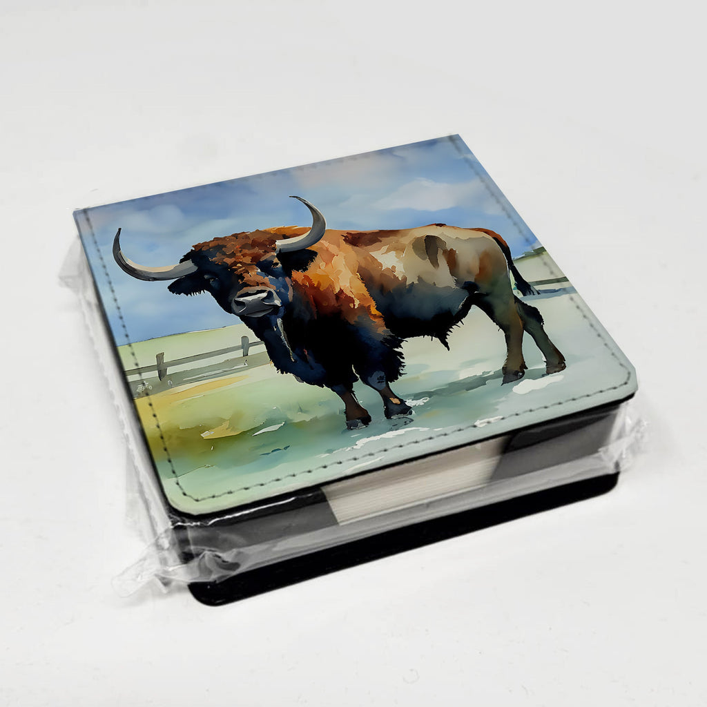 PU Leather Note Paper Holder featuring breed specific American Bison artwork. Elevate your workspace with this PU Leather Note Paper Holder, crafted to resemble luxurious leather without the use of animal products. Made from durable synthetic PU leather, it offers both a premium look and eco-friendly appeal. This note holder, compactly sized at 4.25 x 4.25 x 1.25 inches, includes about 160 sheets of 3.75 x 3.75-inch note paper—ideal for quick notes and reminders. An exclusive artist-designed cover makes each holder uniquely vibrant, adding a splash of color and personality to any desk or office. The discrete design keeps note paper hidden, maintaining a neat and organized workspace. Perfect as a gift or for personal use, this stylish holder is refillable with standard paper, ensuring long-lasting utility. A must-have for anyone seeking a sophisticated, artful touch to their workspace while supporting animal-friendly products. Add style, organization, and creativity to your everyday routine with this elegant note paper holder.