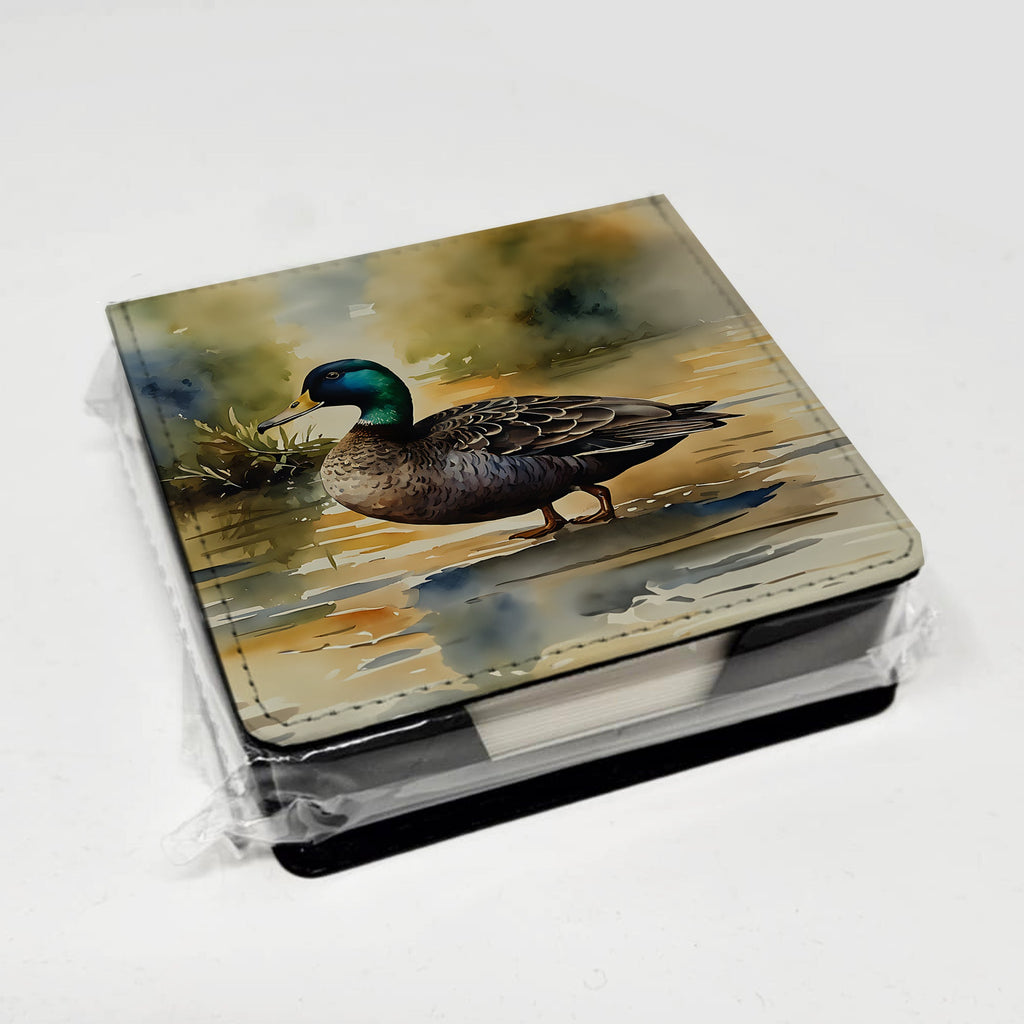 PU Leather Note Paper Holder featuring breed specific American Black Duck artwork. Elevate your workspace with this PU Leather Note Paper Holder, crafted to resemble luxurious leather without the use of animal products. Made from durable synthetic PU leather, it offers both a premium look and eco-friendly appeal. This note holder, compactly sized at 4.25 x 4.25 x 1.25 inches, includes about 160 sheets of 3.75 x 3.75-inch note paper—ideal for quick notes and reminders. An exclusive artist-designed cover makes each holder uniquely vibrant, adding a splash of color and personality to any desk or office. The discrete design keeps note paper hidden, maintaining a neat and organized workspace. Perfect as a gift or for personal use, this stylish holder is refillable with standard paper, ensuring long-lasting utility. A must-have for anyone seeking a sophisticated, artful touch to their workspace while supporting animal-friendly products. Add style, organization, and creativity to your everyday routine with this elegant note paper holder.