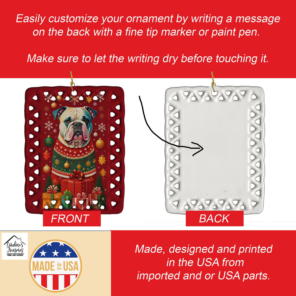 Porcelain Ornament featuring breed specific American Bulldog artwork. Celebrate Christmas with this Christmas Ornament. Add a unique, personal touch to your holiday decor with our Rectangular Lattice Porcelain Ornament. Perfect for creating cherished memories, this high-quality ornament shines under festive lights, reflecting warmth and joy throughout your Christmas tree. Crafted with a glossy finish, it showcases vibrant, full-color artwork contributed by our talented artists, ensuring your tree is adorned with a burst of color and holiday spirit. What sets this Porcelain Ornament apart is its customizable white back. Use a paint pen or permanent marker to write a heartfelt message, commemorate a special year, or mark an unforgettable date, turning this ornament into a keepsake that will be treasured for years to come. For best results, allow any personalization to dry thoroughly before handling. Each ornament comes complete with a delicate gold cord, making it easy to hang and display. Proudly made in the USA, this ornament measures 3.375 x 2.625 inches and is a thoughtful gift for pet sitters, teachers, family members, or anyone who would appreciate a little extra holiday magic. Bring style, charm, and a touch of personal meaning to your Christmas tree with this beautifully designed ornament..