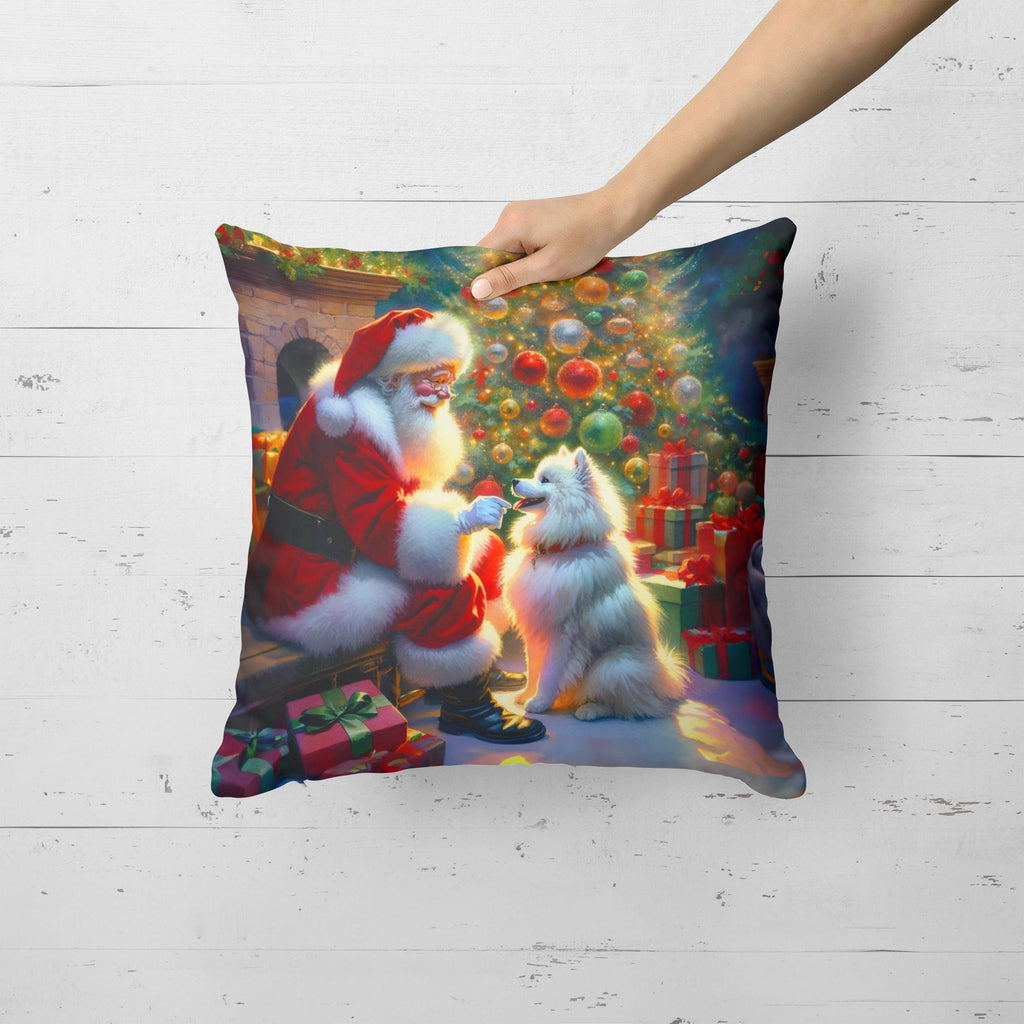Throw Pillow featuring breed specific American Eskimo artwork. Celebrate Christmas with this Christmas Pillow. Revitalize your outdoor or indoor living space with Caroline's Treasures 18x18 Fabric Decorative Pillow. With a generously sized dimension of approximately 18 inches by 18 inches, this pillow makes a comfortable and aesthetic addition to any seating area. Made from a unique, water-resistant material developed by Caroline's Treasures, the pillow sham is 100% polyester fabric that's durable and ready to weather any condition. Its vibrant, full-color artwork will not fade over time as it is dyed with color-fast dyes. Whether you place it on your patio furniture, porch, veranda, or indoor couch, its soft canvas fabric ensures a cozy experience. The pillow is handcrafted in the United States, featuring a sham created from three pieces of fabric and a polyester insert for enduring shape and overstuffed comfort. Despite being robustly built to endure the outdoors, it is as soft and snug as your favorite indoor cushions. Please note, as all our pillows are handmade, sizes may vary slightly, adding to the charm of this unique decorative item.