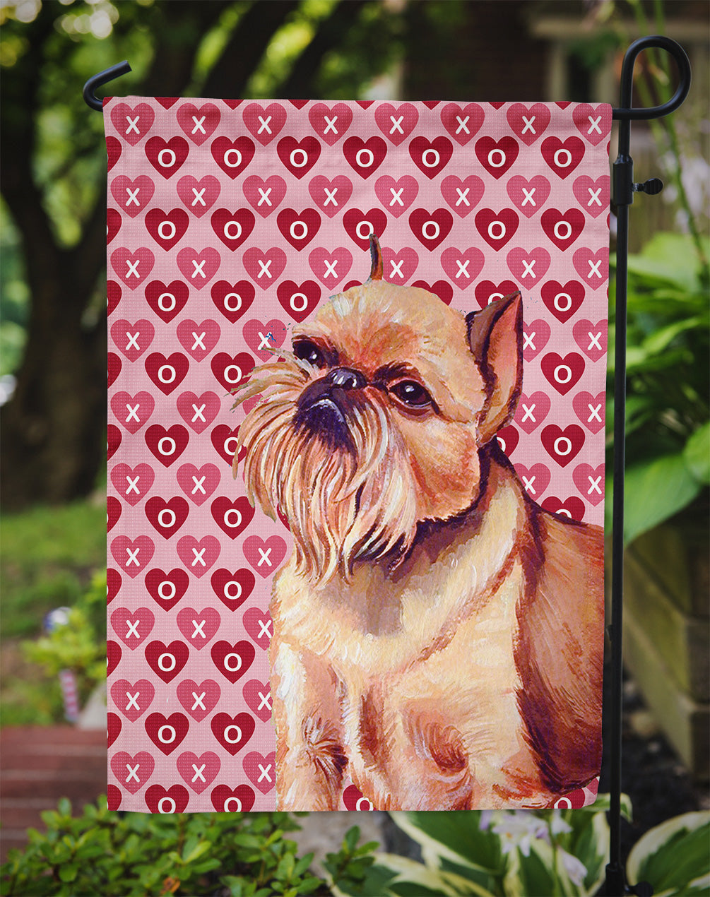 Decorate your space with our Valentine's Day Brussels Griffon artwork on a Garden Flag. Enhance the beauty of your garden, patio, or yard with Caroline's Treasures Decorative Garden Flag, proudly made in the USA. Crafted from two pieces of thick, double-sided polyester fabric, this 2-ply garden flag is designed to withstand various weather conditions, making it water-resistant and weatherproof. Featuring correctly readable words on both sides, this garden flag offers a delightful visual experience from any angle. With its heavier weight, it stands out among other garden flags, ensuring stability and durability even in wind, rain, and snow. Measuring approximately 11 1/4 inches by 15 1/2 inches, this flag allows you to personalize your outdoor decor. It comes with a 1 1/2-inch sleeve sewn in, allowing easy attachment to any standard garden flag stand or garden size porch hanger (sold separately). Make a statement in your outdoor space with Caroline's Treasures Decorative Garden Flag, a vibrant and high-quality flag that adds color and personality to your surroundings. Proudly made in the USA, it's a symbol of quality craftsmanship and attention to detail.