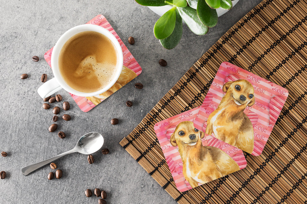 Decorate your space with our Valentine's Day Chihuahua artwork on a Coaster set. Presenting our Set of 4 Foam Coasters, a stylish and practical addition to your table setting. Each square coaster, measuring 3 1/2 inches by 3 1/2 inches, is perfectly sized to accommodate various drinkware, from coffee mugs to tumblers. These coasters stand out with their full-color artwork, permanently dyed onto the material for a vibrant and fade-resistant finish. They're not just functional, they're a fashionable statement, adding a touch of flair to any gathering or event. Our foam coasters serve a dual purpose - they protect your table from water stains and are perfect for both hot and cold drinks. The material used is similar to that of our high-quality mouse pads, ensuring durability and heat resistance. These coasters are easy to maintain - simply wash them in the top of your dishwasher and lay flat to dry. The design won't come off, ensuring they retain their vivid colors for years. Pair them with one of our insulated coolers or huggers for a cohesive, thoughtful gift set. Enhance your beverage experience with our Set of 4 Foam Coasters.
