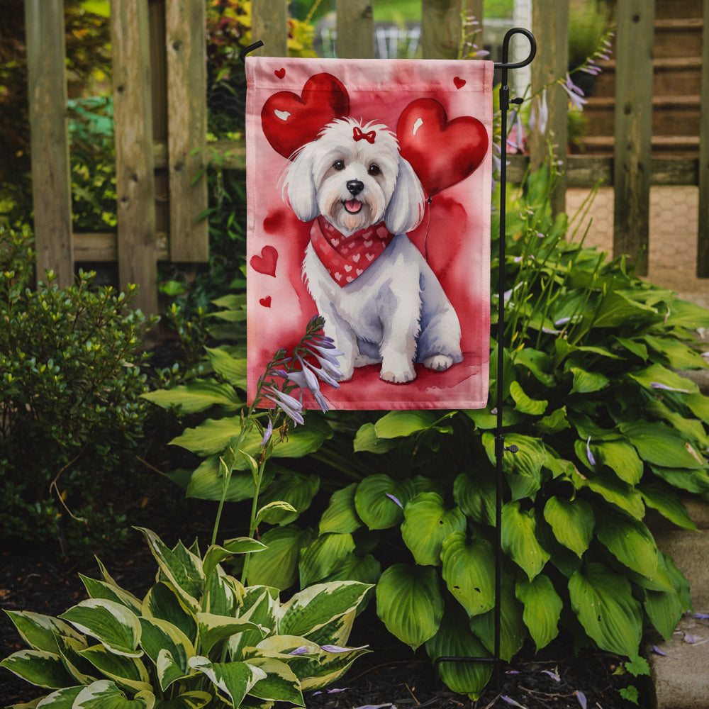 Decorate your space with our Valentine's Day Coton de Tulear artwork on a Garden Flag. Enhance the beauty of your garden, patio, or yard with Caroline's Treasures Decorative Garden Flag, proudly made in the USA. Crafted from two pieces of thick, double-sided polyester fabric, this 2-ply garden flag is designed to withstand various weather conditions, making it water-resistant and weatherproof. Featuring correctly readable words on both sides, this garden flag offers a delightful visual experience from any angle. With its heavier weight, it stands out among other garden flags, ensuring stability and durability even in wind, rain, and snow. Measuring approximately 11 1/4 inches by 15 1/2 inches, this flag allows you to personalize your outdoor decor. It comes with a 1 1/2-inch sleeve sewn in, allowing easy attachment to any standard garden flag stand or garden size porch hanger (sold separately). Make a statement in your outdoor space with Caroline's Treasures Decorative Garden Flag, a vibrant and high-quality flag that adds color and personality to your surroundings. Proudly made in the USA, it's a symbol of quality craftsmanship and attention to detail.