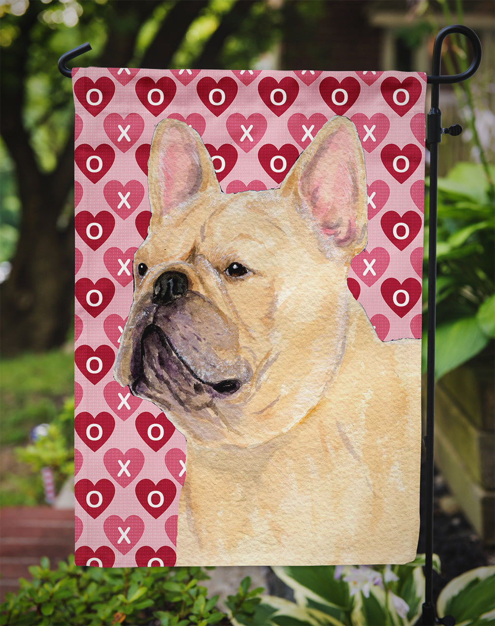 Decorate your space with our Valentine's Day French Bulldog artwork on a Garden Flag. Enhance the beauty of your garden, patio, or yard with Caroline's Treasures Decorative Garden Flag, proudly made in the USA. Crafted from two pieces of thick, double-sided polyester fabric, this 2-ply garden flag is designed to withstand various weather conditions, making it water-resistant and weatherproof. Featuring correctly readable words on both sides, this garden flag offers a delightful visual experience from any angle. With its heavier weight, it stands out among other garden flags, ensuring stability and durability even in wind, rain, and snow. Measuring approximately 11 1/4 inches by 15 1/2 inches, this flag allows you to personalize your outdoor decor. It comes with a 1 1/2-inch sleeve sewn in, allowing easy attachment to any standard garden flag stand or garden size porch hanger (sold separately). Make a statement in your outdoor space with Caroline's Treasures Decorative Garden Flag, a vibrant and high-quality flag that adds color and personality to your surroundings. Proudly made in the USA, it's a symbol of quality craftsmanship and attention to detail.