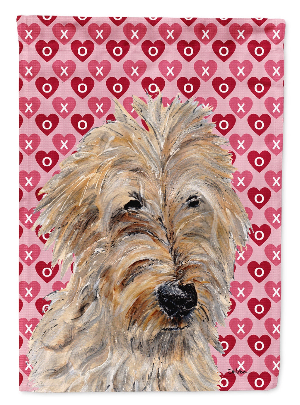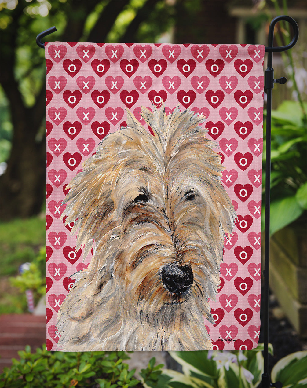 Decorate your space with our Valentine's Day Goldendoodle artwork on a Garden Flag. Enhance the beauty of your garden, patio, or yard with Caroline's Treasures Decorative Garden Flag, proudly made in the USA. Crafted from two pieces of thick, double-sided polyester fabric, this 2-ply garden flag is designed to withstand various weather conditions, making it water-resistant and weatherproof. Featuring correctly readable words on both sides, this garden flag offers a delightful visual experience from any angle. With its heavier weight, it stands out among other garden flags, ensuring stability and durability even in wind, rain, and snow. Measuring approximately 11 1/4 inches by 15 1/2 inches, this flag allows you to personalize your outdoor decor. It comes with a 1 1/2-inch sleeve sewn in, allowing easy attachment to any standard garden flag stand or garden size porch hanger (sold separately). Make a statement in your outdoor space with Caroline's Treasures Decorative Garden Flag, a vibrant and high-quality flag that adds color and personality to your surroundings. Proudly made in the USA, it's a symbol of quality craftsmanship and attention to detail.