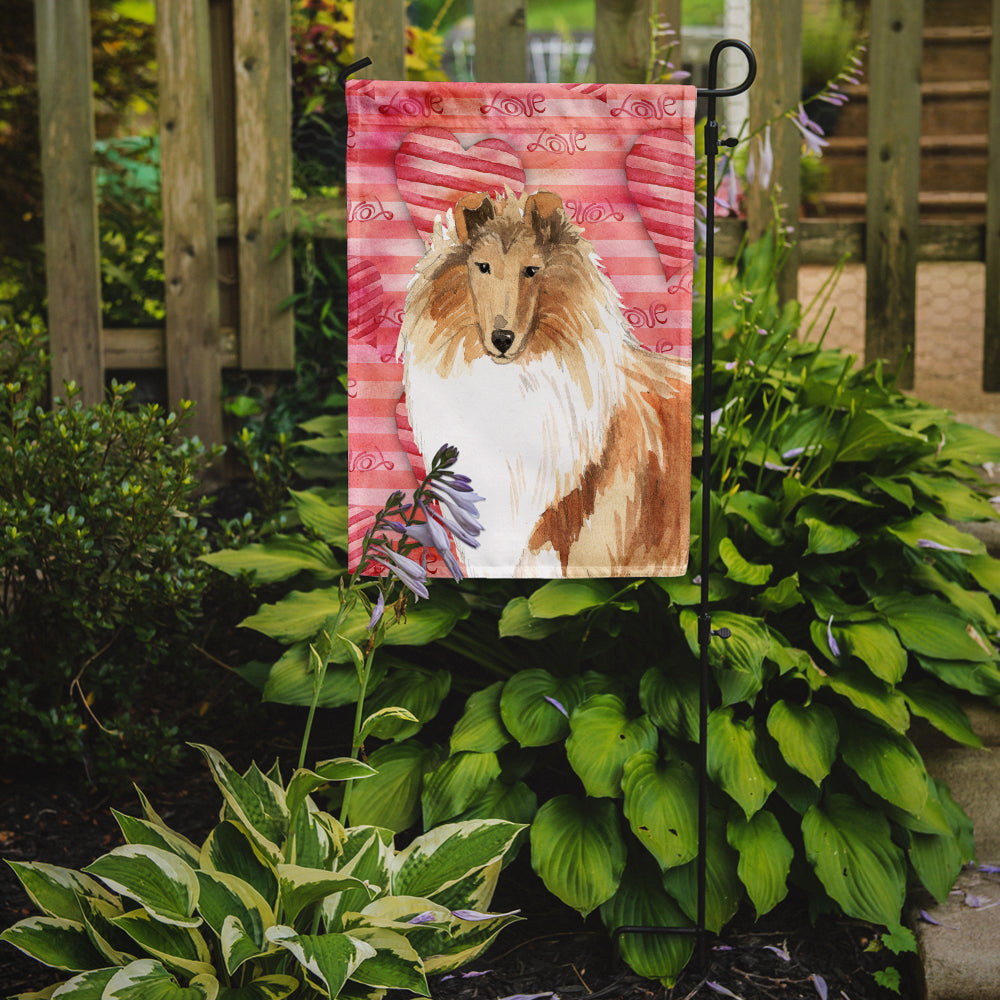 Decorate your space with our Valentine's Day Collie artwork on a Garden Flag. Enhance the beauty of your garden, patio, or yard with Caroline's Treasures Decorative Garden Flag, proudly made in the USA. Crafted from two pieces of thick, double-sided polyester fabric, this 2-ply garden flag is designed to withstand various weather conditions, making it water-resistant and weatherproof. Featuring correctly readable words on both sides, this garden flag offers a delightful visual experience from any angle. With its heavier weight, it stands out among other garden flags, ensuring stability and durability even in wind, rain, and snow. Measuring approximately 11 1/4 inches by 15 1/2 inches, this flag allows you to personalize your outdoor decor. It comes with a 1 1/2-inch sleeve sewn in, allowing easy attachment to any standard garden flag stand or garden size porch hanger (sold separately). Make a statement in your outdoor space with Caroline's Treasures Decorative Garden Flag, a vibrant and high-quality flag that adds color and personality to your surroundings. Proudly made in the USA, it's a symbol of quality craftsmanship and attention to detail.