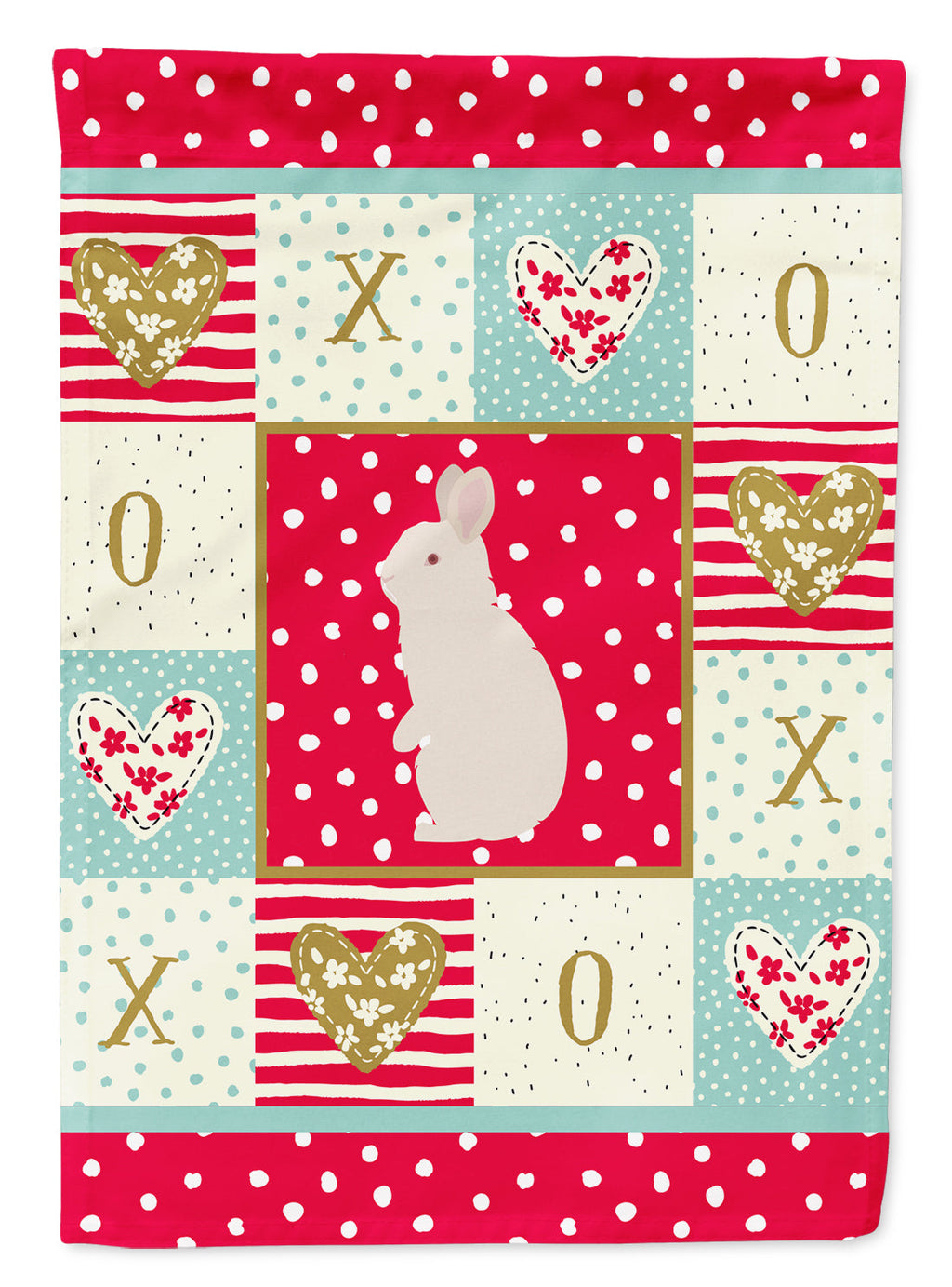 Decorate your space with our Valentine's Day New Zealand White Rabbit artwork on a Garden Flag. Enhance the beauty of your garden, patio, or yard with Caroline's Treasures Decorative Garden Flag, proudly made in the USA. Crafted from two pieces of thick, double-sided polyester fabric, this 2-ply garden flag is designed to withstand various weather conditions, making it water-resistant and weatherproof. Featuring correctly readable words on both sides, this garden flag offers a delightful visual experience from any angle. With its heavier weight, it stands out among other garden flags, ensuring stability and durability even in wind, rain, and snow. Measuring approximately 11 1/4 inches by 15 1/2 inches, this flag allows you to personalize your outdoor decor. It comes with a 1 1/2-inch sleeve sewn in, allowing easy attachment to any standard garden flag stand or garden size porch hanger (sold separately). Make a statement in your outdoor space with Caroline's Treasures Decorative Garden Flag, a vibrant and high-quality flag that adds color and personality to your surroundings. Proudly made in the USA, it's a symbol of quality craftsmanship and attention to detail.