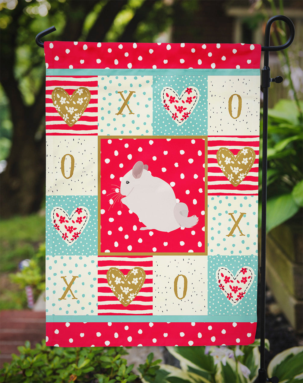 Decorate your space with our Valentine's Day Pink and White Chinchilla artwork on a Garden Flag. Enhance the beauty of your garden, patio, or yard with Caroline's Treasures Decorative Garden Flag, proudly made in the USA. Crafted from two pieces of thick, double-sided polyester fabric, this 2-ply garden flag is designed to withstand various weather conditions, making it water-resistant and weatherproof. Featuring correctly readable words on both sides, this garden flag offers a delightful visual experience from any angle. With its heavier weight, it stands out among other garden flags, ensuring stability and durability even in wind, rain, and snow. Measuring approximately 11 1/4 inches by 15 1/2 inches, this flag allows you to personalize your outdoor decor. It comes with a 1 1/2-inch sleeve sewn in, allowing easy attachment to any standard garden flag stand or garden size porch hanger (sold separately). Make a statement in your outdoor space with Caroline's Treasures Decorative Garden Flag, a vibrant and high-quality flag that adds color and personality to your surroundings. Proudly made in the USA, it's a symbol of quality craftsmanship and attention to detail.