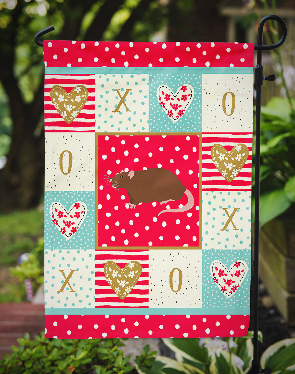 Decorate your space with our Valentine's Day Rex Rat artwork on a Garden Flag. Enhance the beauty of your garden, patio, or yard with Caroline's Treasures Decorative Garden Flag, proudly made in the USA. Crafted from two pieces of thick, double-sided polyester fabric, this 2-ply garden flag is designed to withstand various weather conditions, making it water-resistant and weatherproof. Featuring correctly readable words on both sides, this garden flag offers a delightful visual experience from any angle. With its heavier weight, it stands out among other garden flags, ensuring stability and durability even in wind, rain, and snow. Measuring approximately 11 1/4 inches by 15 1/2 inches, this flag allows you to personalize your outdoor decor. It comes with a 1 1/2-inch sleeve sewn in, allowing easy attachment to any standard garden flag stand or garden size porch hanger (sold separately). Make a statement in your outdoor space with Caroline's Treasures Decorative Garden Flag, a vibrant and high-quality flag that adds color and personality to your surroundings. Proudly made in the USA, it's a symbol of quality craftsmanship and attention to detail.