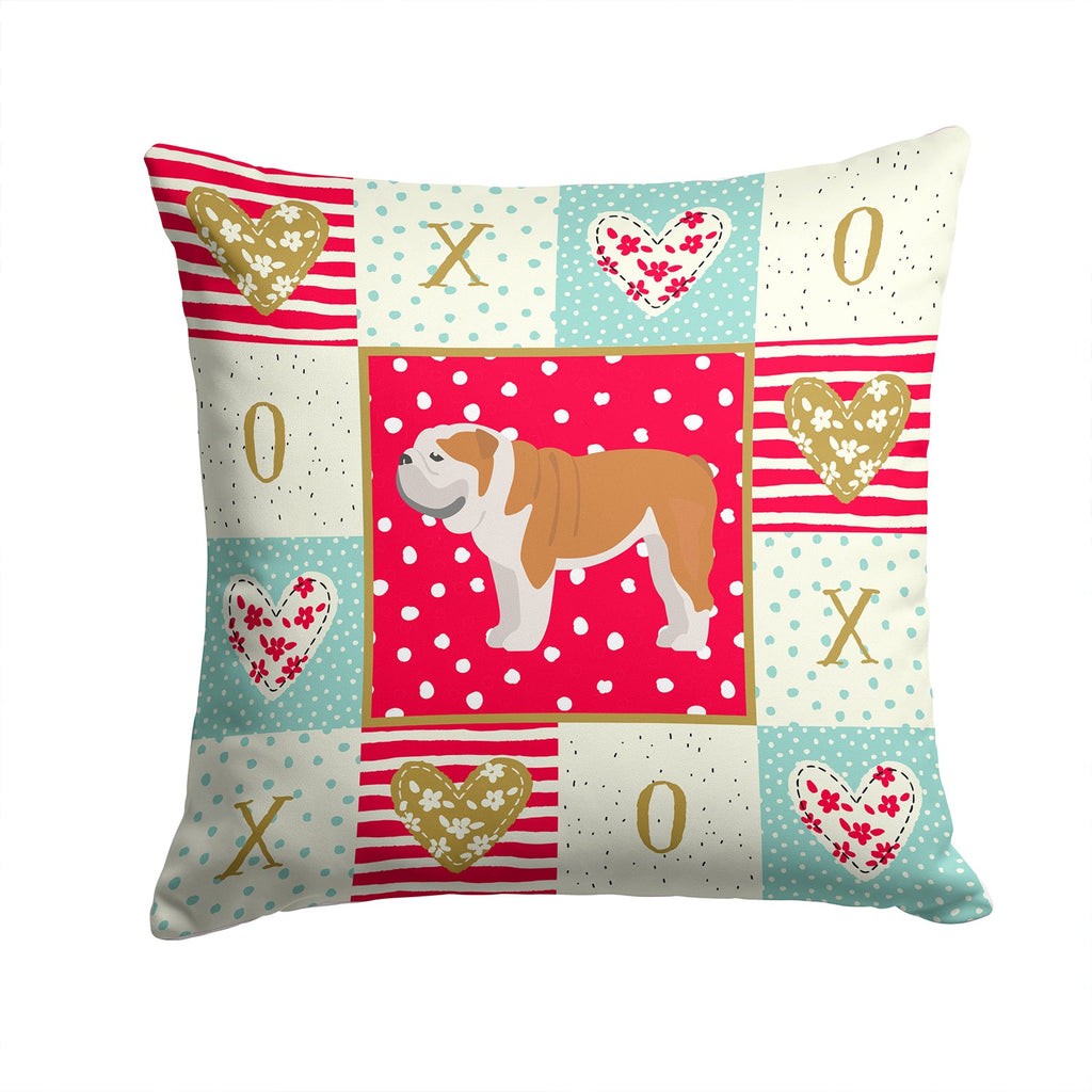 Decorate your space with our Valentine's Day Bulldog, English Bulldog artwork on a Pillow. Add a touch of vibrancy and comfort to your outdoor seating with Caroline's Treasures Fabric Decorative Pillow. Measuring approximately 14 inches by 14 inches, this outdoor pillow is crafted to elevate the appeal of your patio furniture, infusing it with vivid color and artistic flair. The pillow includes a 100% Polyester Fabric sham filled with a quality pillow form to provide superior comfort. Innovatively made from our brand new material, specifically woven for its water resistance, this pillow is designed for durability. The soft canvas fabric offers versatility in use, fit for your indoor couch or your outdoor patio, porch, or veranda. The fabric is dyed with colorfast dyes built for resilience against weather conditions, ensuring the pillow retains its beauty over time. Constructed by sewing three fabric pieces to create a sham, the polyester insert is then nestled inside to form the pillow, resulting in an overstuffed pillow that maintains its shape. Both the sham and the pillow insert are proudly made in the United States. As the pillows are handcrafted, there may be minor variations in size, further enhancing their unique charm. Experience comfort in style with Caroline's Treasures Fabric Decorative Pillow.