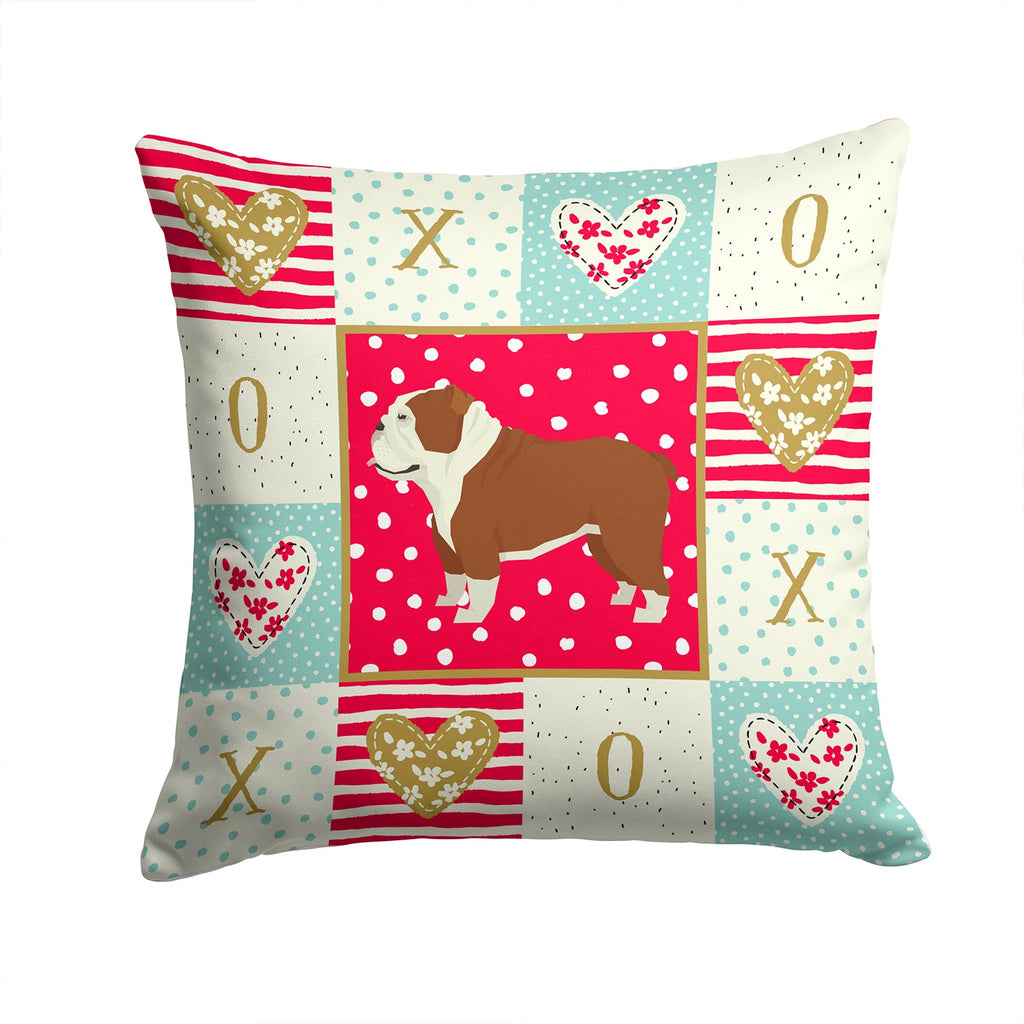 Decorate your space with our Valentine's Day Bulldog, English Bulldog artwork on a Pillow. Add a touch of vibrancy and comfort to your outdoor seating with Caroline's Treasures Fabric Decorative Pillow. Measuring approximately 14 inches by 14 inches, this outdoor pillow is crafted to elevate the appeal of your patio furniture, infusing it with vivid color and artistic flair. The pillow includes a 100% Polyester Fabric sham filled with a quality pillow form to provide superior comfort. Innovatively made from our brand new material, specifically woven for its water resistance, this pillow is designed for durability. The soft canvas fabric offers versatility in use, fit for your indoor couch or your outdoor patio, porch, or veranda. The fabric is dyed with colorfast dyes built for resilience against weather conditions, ensuring the pillow retains its beauty over time. Constructed by sewing three fabric pieces to create a sham, the polyester insert is then nestled inside to form the pillow, resulting in an overstuffed pillow that maintains its shape. Both the sham and the pillow insert are proudly made in the United States. As the pillows are handcrafted, there may be minor variations in size, further enhancing their unique charm. Experience comfort in style with Caroline's Treasures Fabric Decorative Pillow.