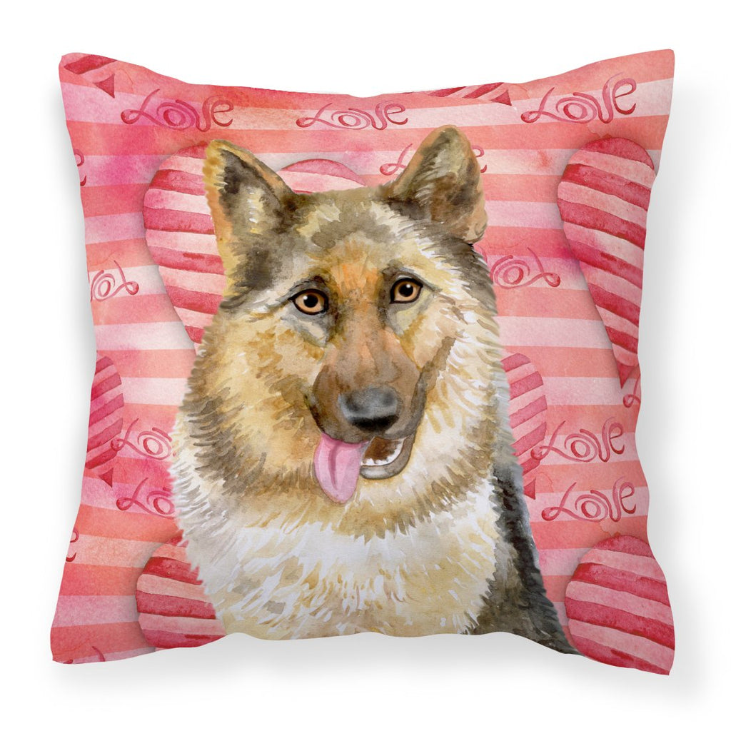 Decorate your space with our Valentine's Day German Shepherd artwork on a Pillow. Revitalize your outdoor or indoor living space with Caroline's Treasures 18x18 Fabric Decorative Pillow. With a generously sized dimension of approximately 18 inches by 18 inches, this pillow makes a comfortable and aesthetic addition to any seating area. Made from a unique, water-resistant material developed by Caroline's Treasures, the pillow sham is 100% polyester fabric that's durable and ready to weather any condition. Its vibrant, full-color artwork will not fade over time as it is dyed with color-fast dyes. Whether you place it on your patio furniture, porch, veranda, or indoor couch, its soft canvas fabric ensures a cozy experience. The pillow is handcrafted in the United States, featuring a sham created from three pieces of fabric and a polyester insert for enduring shape and overstuffed comfort. Despite being robustly built to endure the outdoors, it is as soft and snug as your favorite indoor cushions. Please note, as all our pillows are handmade, sizes may vary slightly, adding to the charm of this unique decorative item.