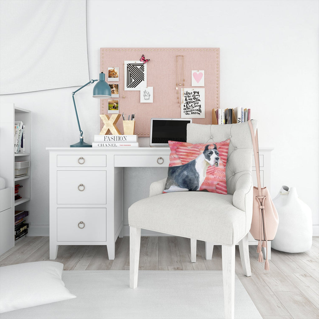 Decorate your space with our Valentine's Day Great Dane artwork on a Pillow. Add a touch of vibrancy and comfort to your outdoor seating with Caroline's Treasures Fabric Decorative Pillow. Measuring approximately 14 inches by 14 inches, this outdoor pillow is crafted to elevate the appeal of your patio furniture, infusing it with vivid color and artistic flair. The pillow includes a 100% Polyester Fabric sham filled with a quality pillow form to provide superior comfort. Innovatively made from our brand new material, specifically woven for its water resistance, this pillow is designed for durability. The soft canvas fabric offers versatility in use, fit for your indoor couch or your outdoor patio, porch, or veranda. The fabric is dyed with colorfast dyes built for resilience against weather conditions, ensuring the pillow retains its beauty over time. Constructed by sewing three fabric pieces to create a sham, the polyester insert is then nestled inside to form the pillow, resulting in an overstuffed pillow that maintains its shape. Both the sham and the pillow insert are proudly made in the United States. As the pillows are handcrafted, there may be minor variations in size, further enhancing their unique charm. Experience comfort in style with Caroline's Treasures Fabric Decorative Pillow.