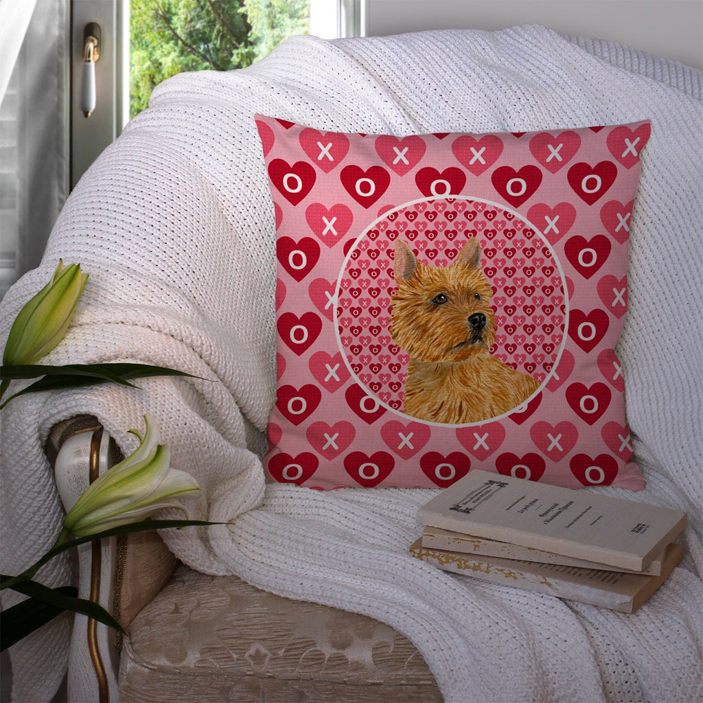 Decorate your space with our Valentine's Day Norwich Terrier artwork on a Pillow. Add a touch of vibrancy and comfort to your outdoor seating with Caroline's Treasures Fabric Decorative Pillow. Measuring approximately 14 inches by 14 inches, this outdoor pillow is crafted to elevate the appeal of your patio furniture, infusing it with vivid color and artistic flair. The pillow includes a 100% Polyester Fabric sham filled with a quality pillow form to provide superior comfort. Innovatively made from our brand new material, specifically woven for its water resistance, this pillow is designed for durability. The soft canvas fabric offers versatility in use, fit for your indoor couch or your outdoor patio, porch, or veranda. The fabric is dyed with colorfast dyes built for resilience against weather conditions, ensuring the pillow retains its beauty over time. Constructed by sewing three fabric pieces to create a sham, the polyester insert is then nestled inside to form the pillow, resulting in an overstuffed pillow that maintains its shape. Both the sham and the pillow insert are proudly made in the United States. As the pillows are handcrafted, there may be minor variations in size, further enhancing their unique charm. Experience comfort in style with Caroline's Treasures Fabric Decorative Pillow.