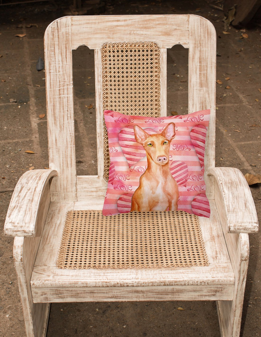 Decorate your space with our Valentine's Day Pharaoh Hound artwork on a Pillow. Revitalize your outdoor or indoor living space with Caroline's Treasures 18x18 Fabric Decorative Pillow. With a generously sized dimension of approximately 18 inches by 18 inches, this pillow makes a comfortable and aesthetic addition to any seating area. Made from a unique, water-resistant material developed by Caroline's Treasures, the pillow sham is 100% polyester fabric that's durable and ready to weather any condition. Its vibrant, full-color artwork will not fade over time as it is dyed with color-fast dyes. Whether you place it on your patio furniture, porch, veranda, or indoor couch, its soft canvas fabric ensures a cozy experience. The pillow is handcrafted in the United States, featuring a sham created from three pieces of fabric and a polyester insert for enduring shape and overstuffed comfort. Despite being robustly built to endure the outdoors, it is as soft and snug as your favorite indoor cushions. Please note, as all our pillows are handmade, sizes may vary slightly, adding to the charm of this unique decorative item.