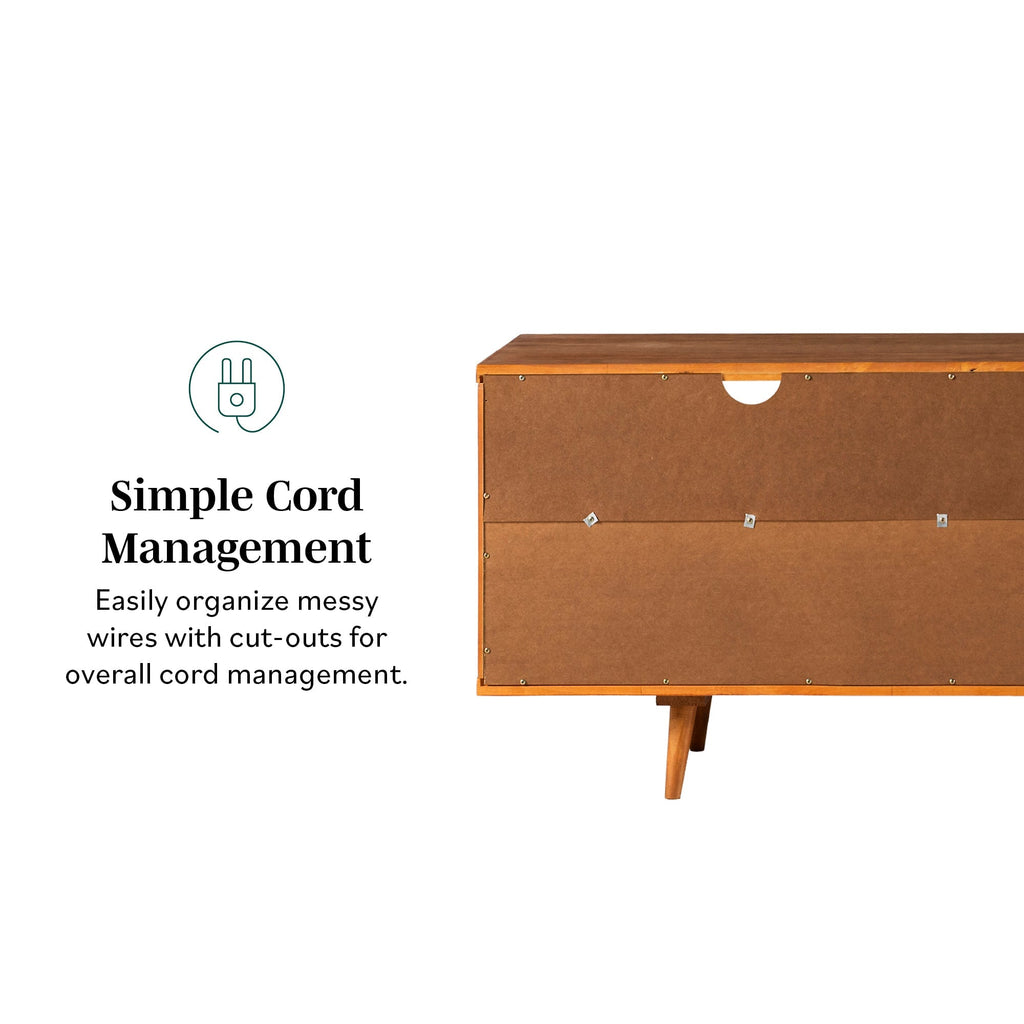 With slightly tapered legs, this 58-inch TV stand features a mid century modern silhouette to complement your home’s aesthetic. Crafted of solid pine wood to showcase a beautiful, natural grain stained finish for a warm texture to your living room. With three easy to access drawers featuring cutout handles, two open shelves above, and cord management to organize your electronics. This TV stand can also be incorporated in your bedroom as a storage cabinet or in your kitchen as a buffet due to its versatile design. Providing additional storage space in your home for the essentials you love most, from your favorite movies to your book collection and family photos. This entertainment center can fit up to a 64-inch TV.