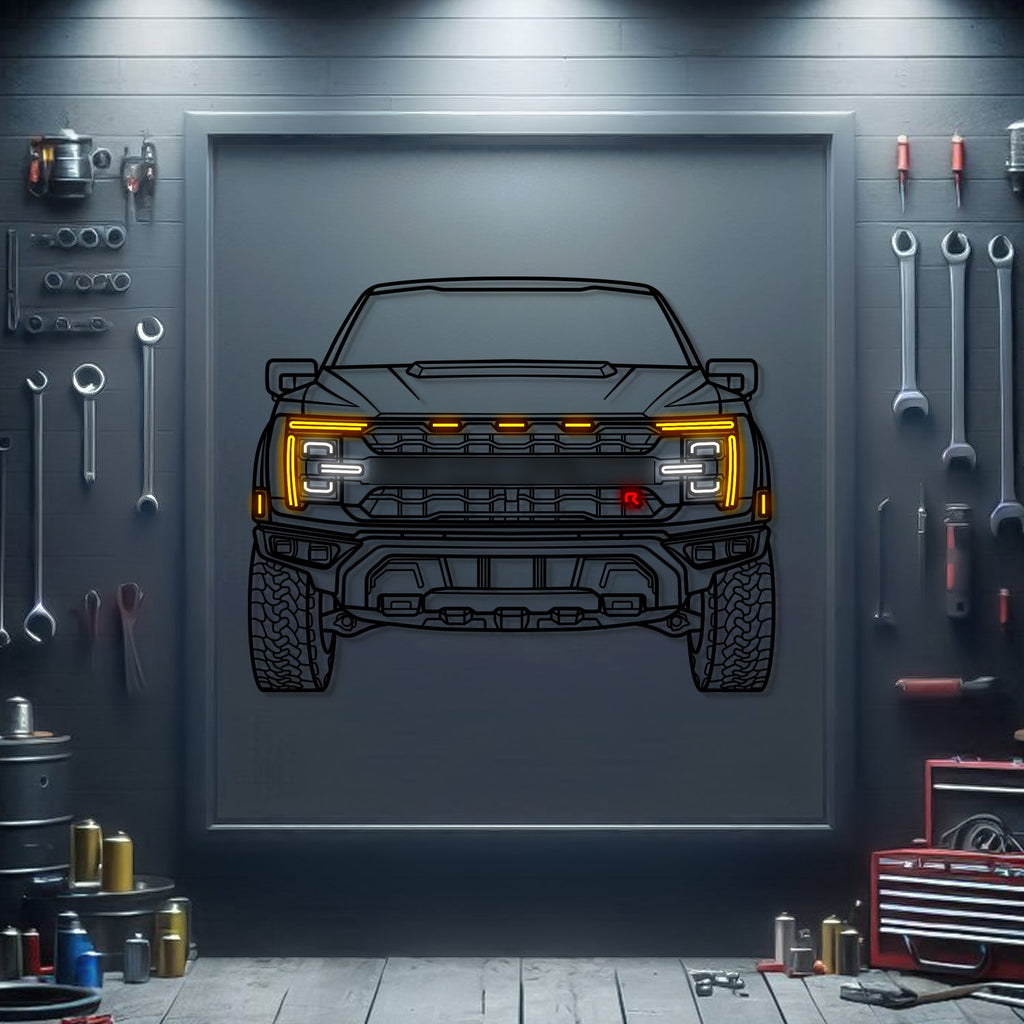 This 2024 F-150 Raptor R Front View Metal Neon Car Wall Art will turn any car enthusiast's home. garage. hallway. living room. bedroom. or office into a unique space. add a stylistic look and captivate petrolheads as well as visitors.